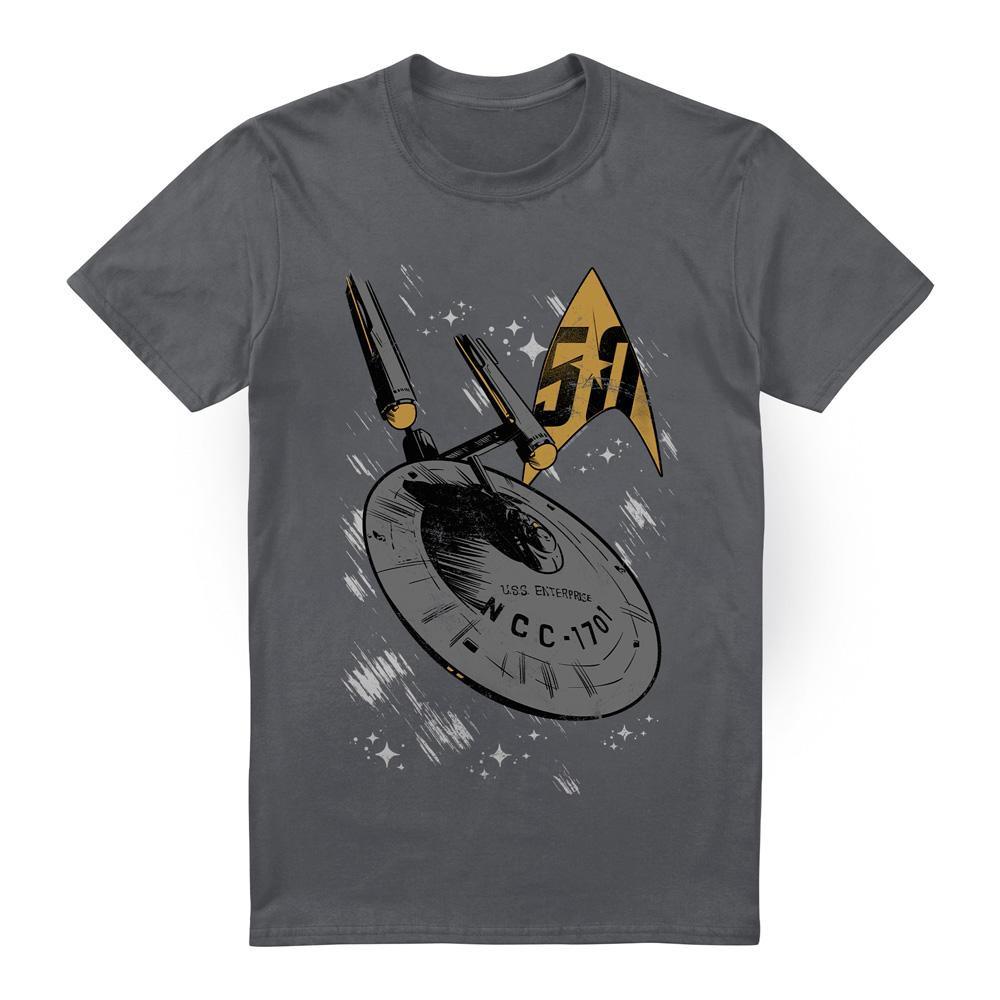 Questa T-shirt presenta una stampa grafica della USS Enterprise NCC-1701, che celebra 50 anni di Star Trek. Il design include una rappresentazione stilizzata dell'iconica astronave con un banner '50', su uno sfondo di sottili esplosioni stellari.