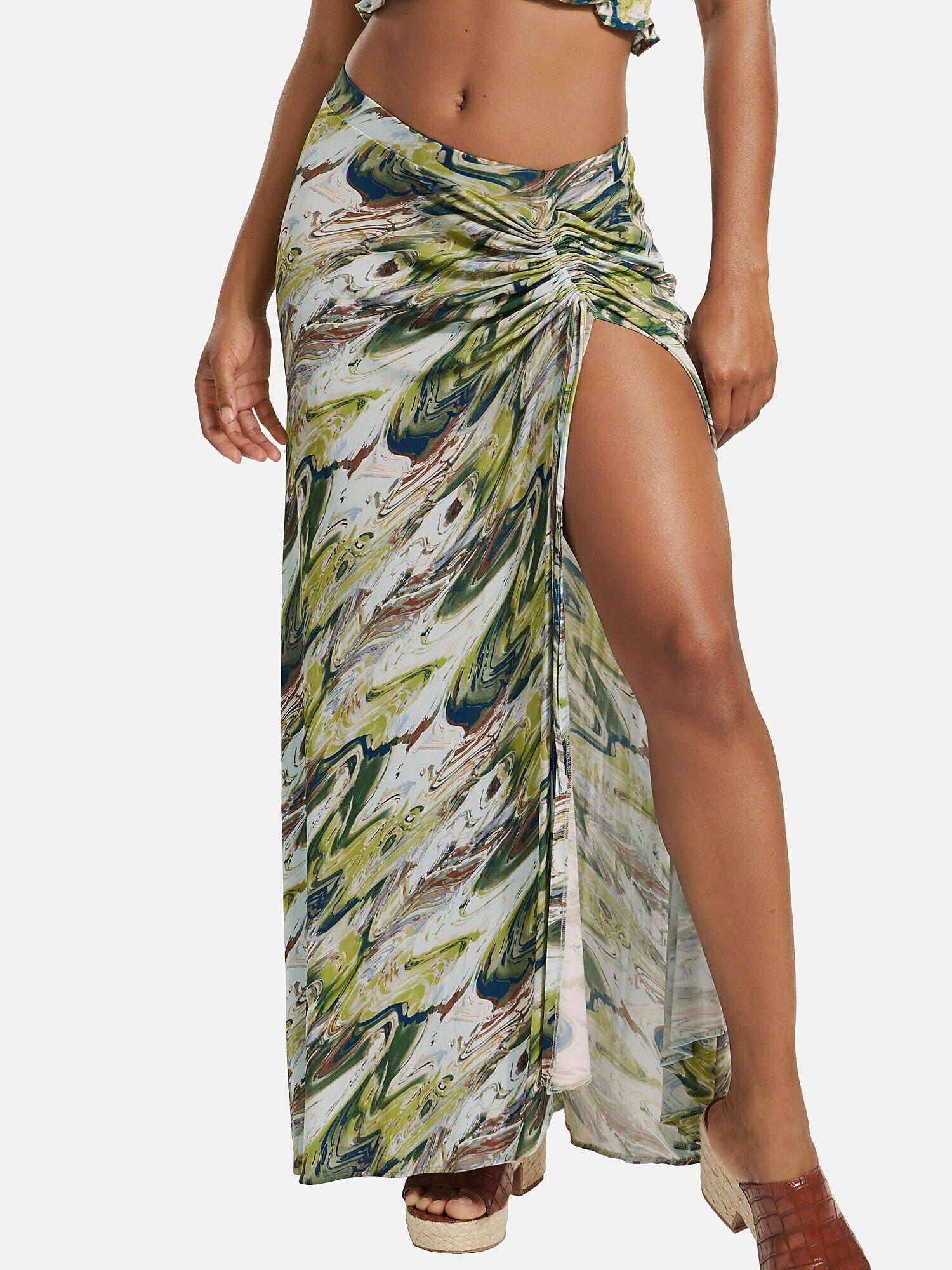 Gonna lunga molto leggera con spacco alto sul lato anteriore sinistro, che può essere regolato con un laccetto. Ampio elastico in vita per una vestibilità confortevole. Può essere indossato in combinazione con un top o con altri capi a scelta. Lunghezza circa 100 cm.