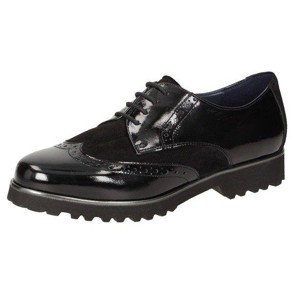 La scarpa stringata Meredith-703-XL da donna in stile boyfriend presenta una punta a coda di rondine e una calzata in larghezza H. È realizzata con una combinazione di pelle di vitello verniciata e pelle scamosciata di agnello, foderata in pelle di vitello e con una fodera tessile elasticizzata nella zona dell'avampiede. Questo design è adatto per piedi con alluce valgo.