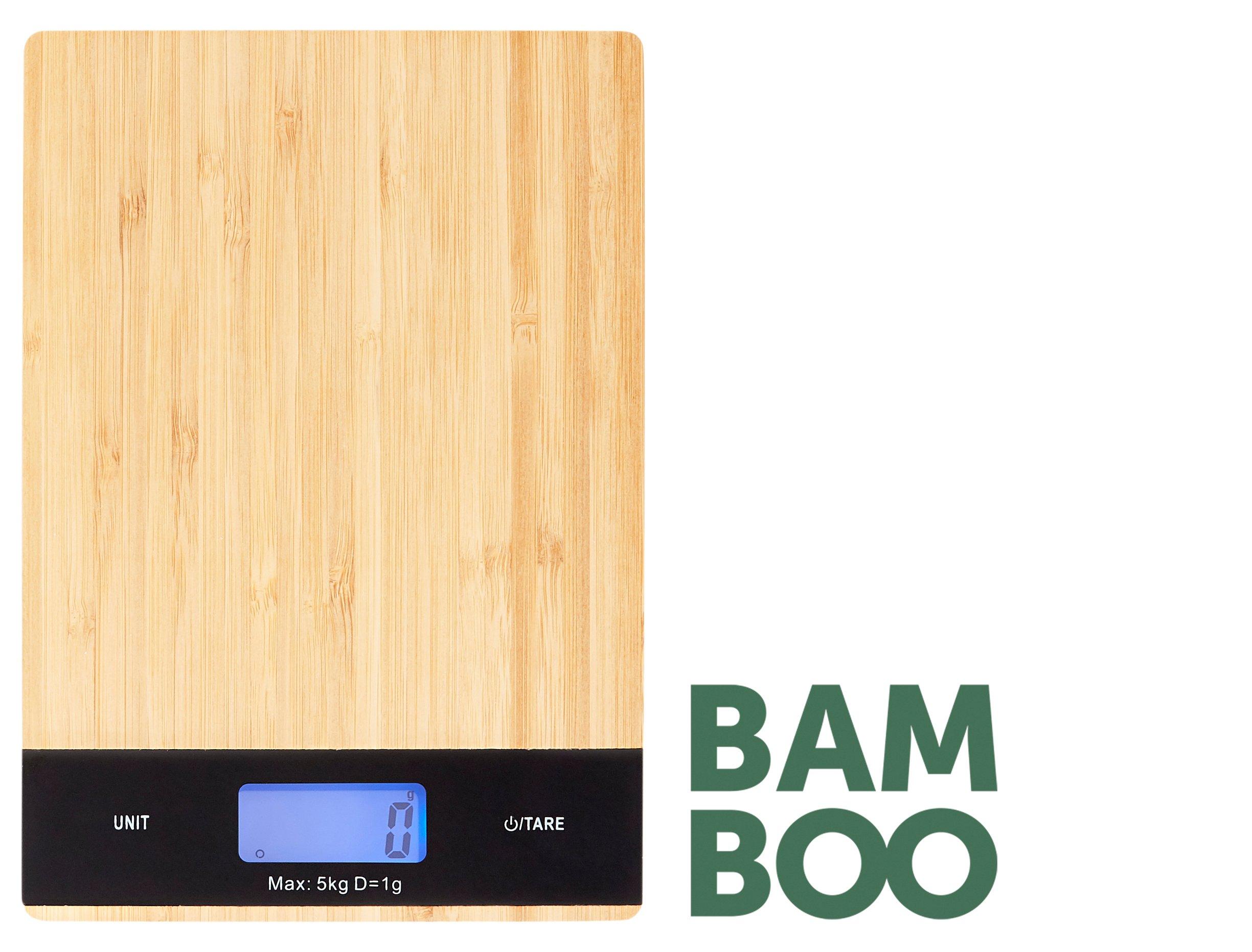 Bilancia da cucina con superficie di pesatura in legno di bambù ecologico. Superficie di pesatura: legno di bambù Funzionamento: sensore touch