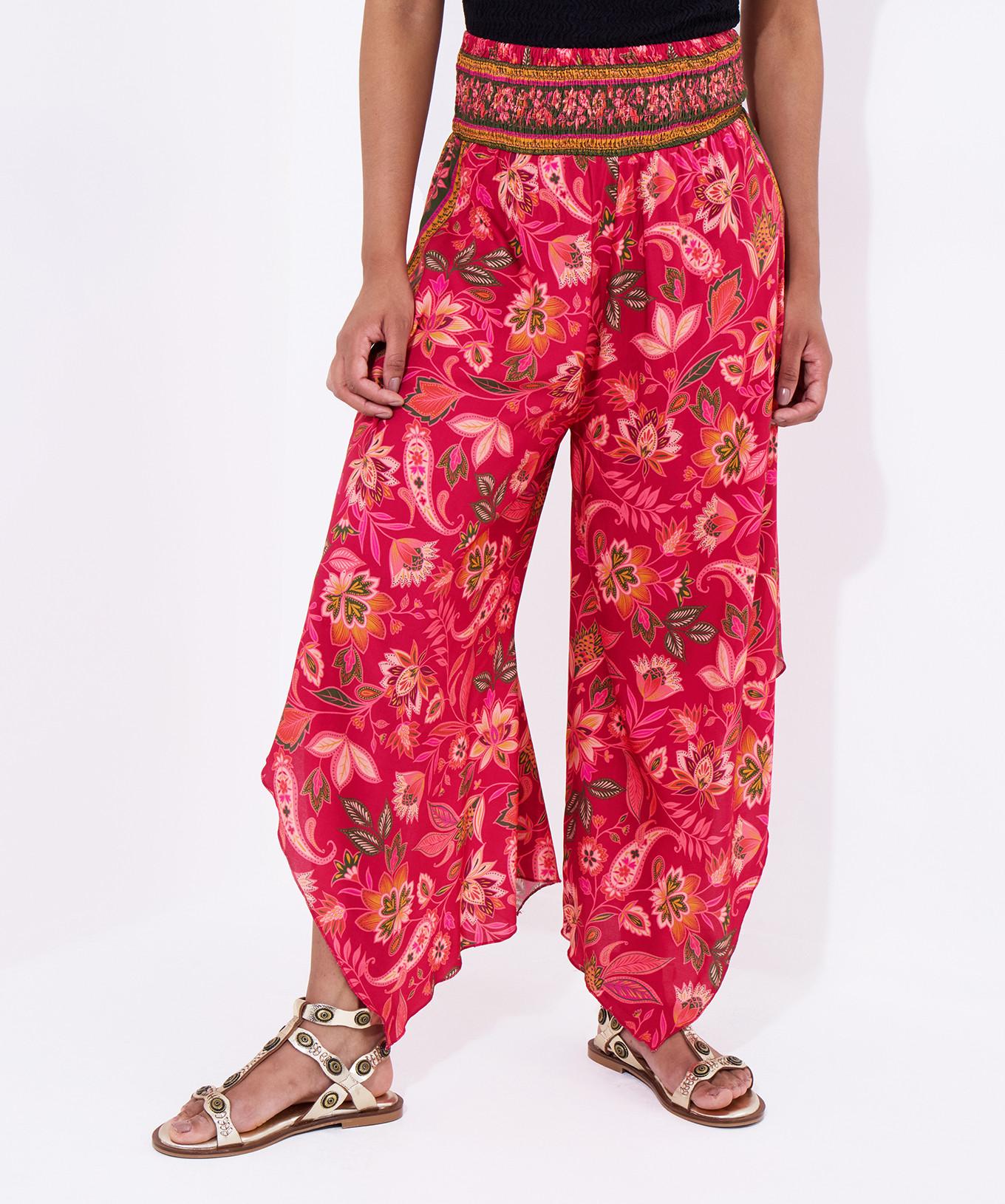 Questi comodi pantaloni presentano un vivace motivo floreale e un design unico dell'orlo, offrendo un look rilassato ed elegante. La vita elasticizzata assicura una vestibilità confortevole, rendendoli adatti a varie occasioni.
