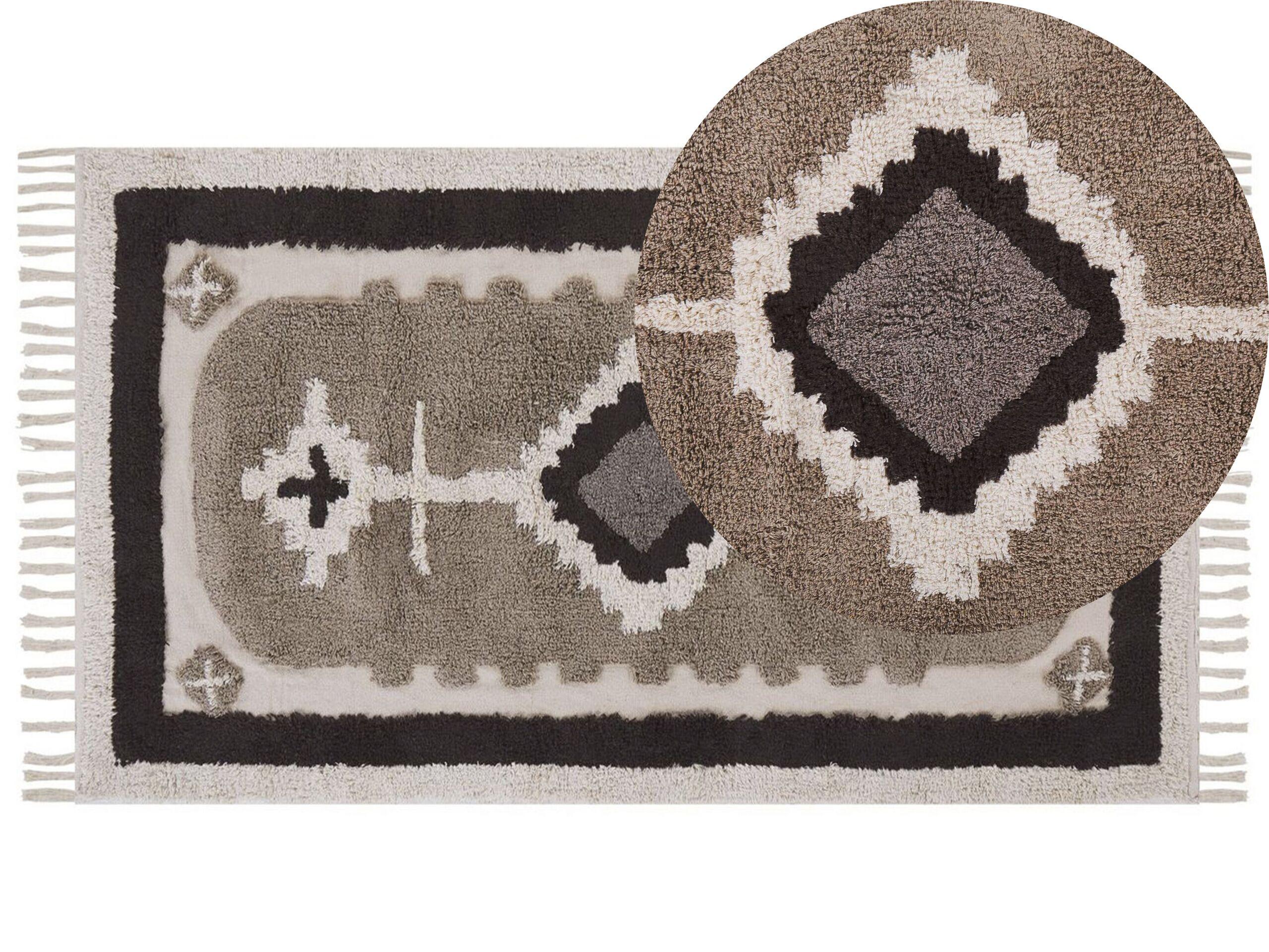 Prezioso tappeto in tre colori con frange decorative. Questo tappeto in stile tradizionale è il complemento perfetto per interni in stile tradizionale o moderno. Realizzato in soffice e durevole cotone naturale, presenta preziose nappe che ne esaltano il design, per un arredo ideale per ogni stile di decorazione.
