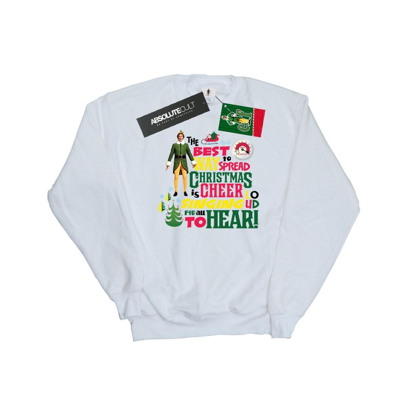 Questa felpa festiva presenta una vivace stampa grafica, perfetta per diffondere l'allegria natalizia. Il design include un personaggio in costume da elfo, circondato da alberi di Natale e fiocchi di neve, con il testo "THE BEST WAY TO SPREAD CHRISTMAS CHEER IS SINGING UP FOR ALL TO HEAR!". È una scelta comoda ed elegante per le festività.