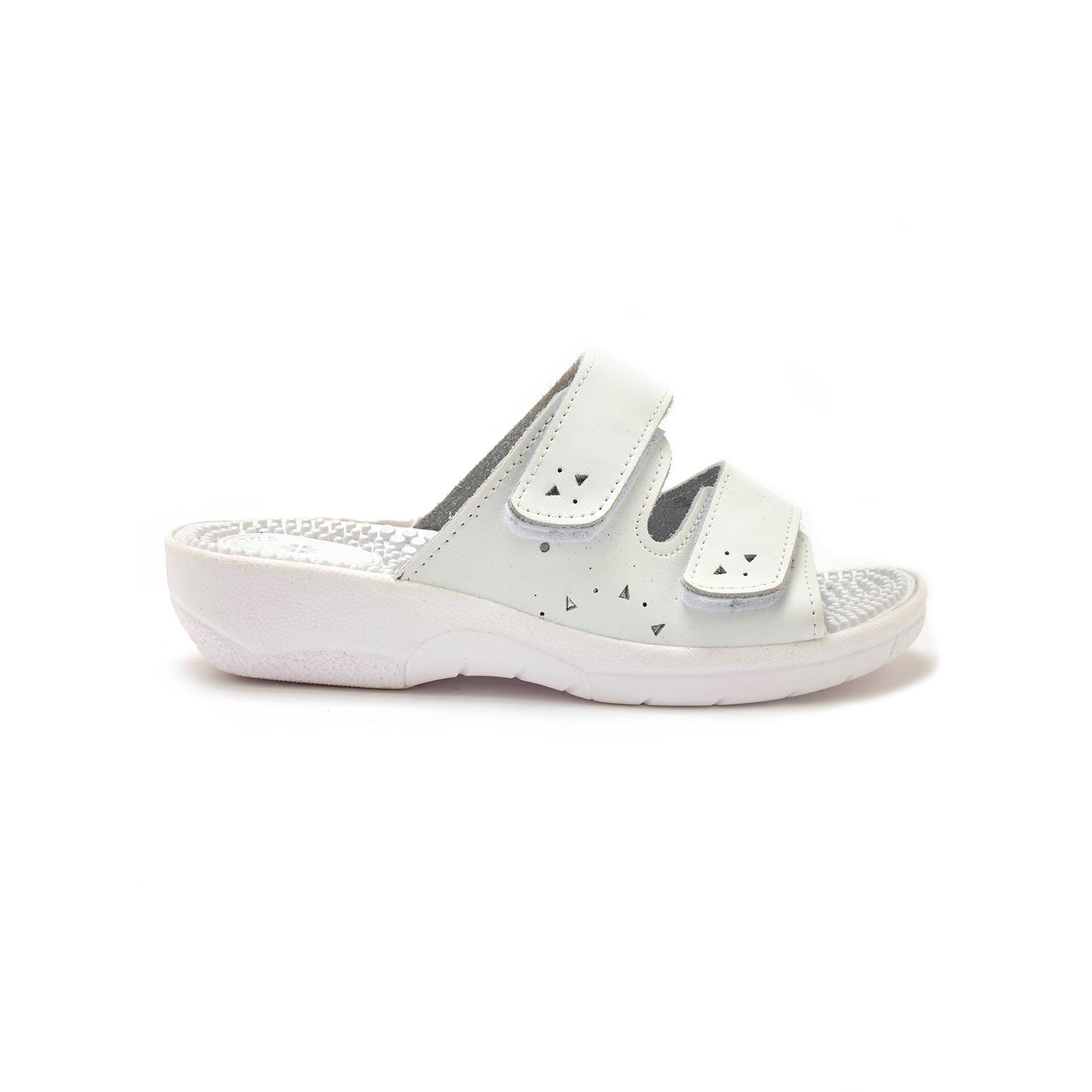Queste mules bianche in pelle offrono un comfort eccezionale. Il piede si inserisce facilmente, il velcro si chiude, e il comfort può essere pienamente goduto. Una caratteristica speciale è la soletta con picchi massaggianti, che offre una piacevole sensazione di relax.