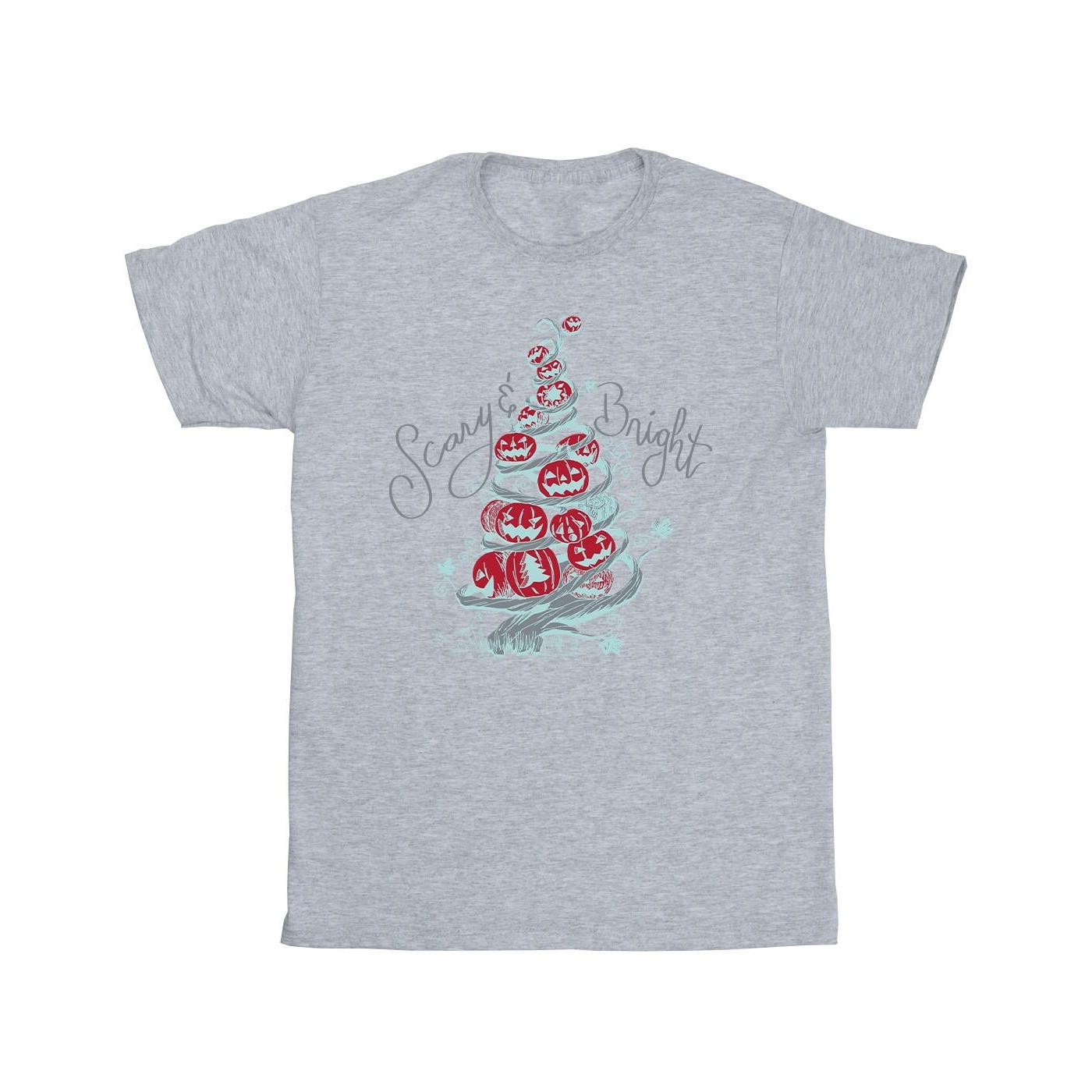Questa T-shirt presenta una grafica unica ispirata a The Nightmare Before Christmas, perfetta per i fan del classico film. Il design mostra un albero di Natale festoso ma spettrale fatto di zucche intagliate, accompagnato dalla frase "Scary & Bright".