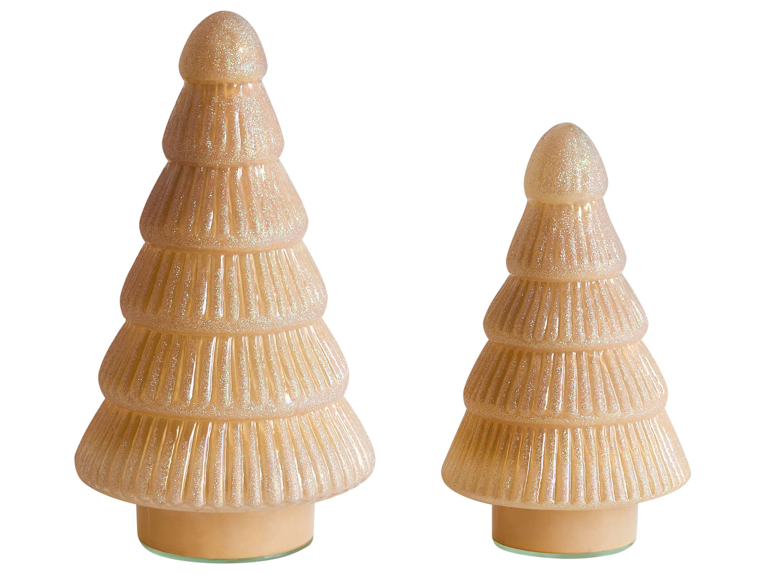 Set di figure di alberi di Natale. Questo incantevole set di due statuine a forma di albero di Natale, realizzate a mano in vetro di alta qualità in una raffinata tonalità beige, è un’aggiunta senza tempo al tuo décor festivo. Le due misure permettono una disposizione versatile, creando un affascinante effetto a livelli. Perfette per qualsiasi superficie — dalla credenza al tavolino da caffè — si abbinano con naturalezza a interni di vari stili.
