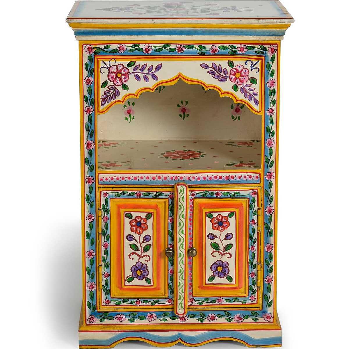 Mobile laterale in legno di mango con 2 ante, dettagli dipinti a mano. - Dimensioni dell'anta: 28 x 18 cm