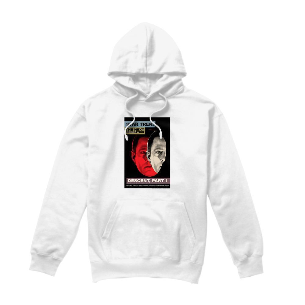 Questa felpa con cappuccio presenta una stampa grafica ispirata a "Star Trek: The Next Generation" Stagione 6, Episodio 26, intitolato "Descent, Part I". Il design mostra un'immagine divisa di due volti, uno rosso e uno bianco, su uno sfondo scuro, con il titolo della serie ben visibile sopra. La felpa con cappuccio è progettata per il comfort e l'abbigliamento casual, rendendola una scelta adatta per i fan dell'iconica serie di fantascienza.