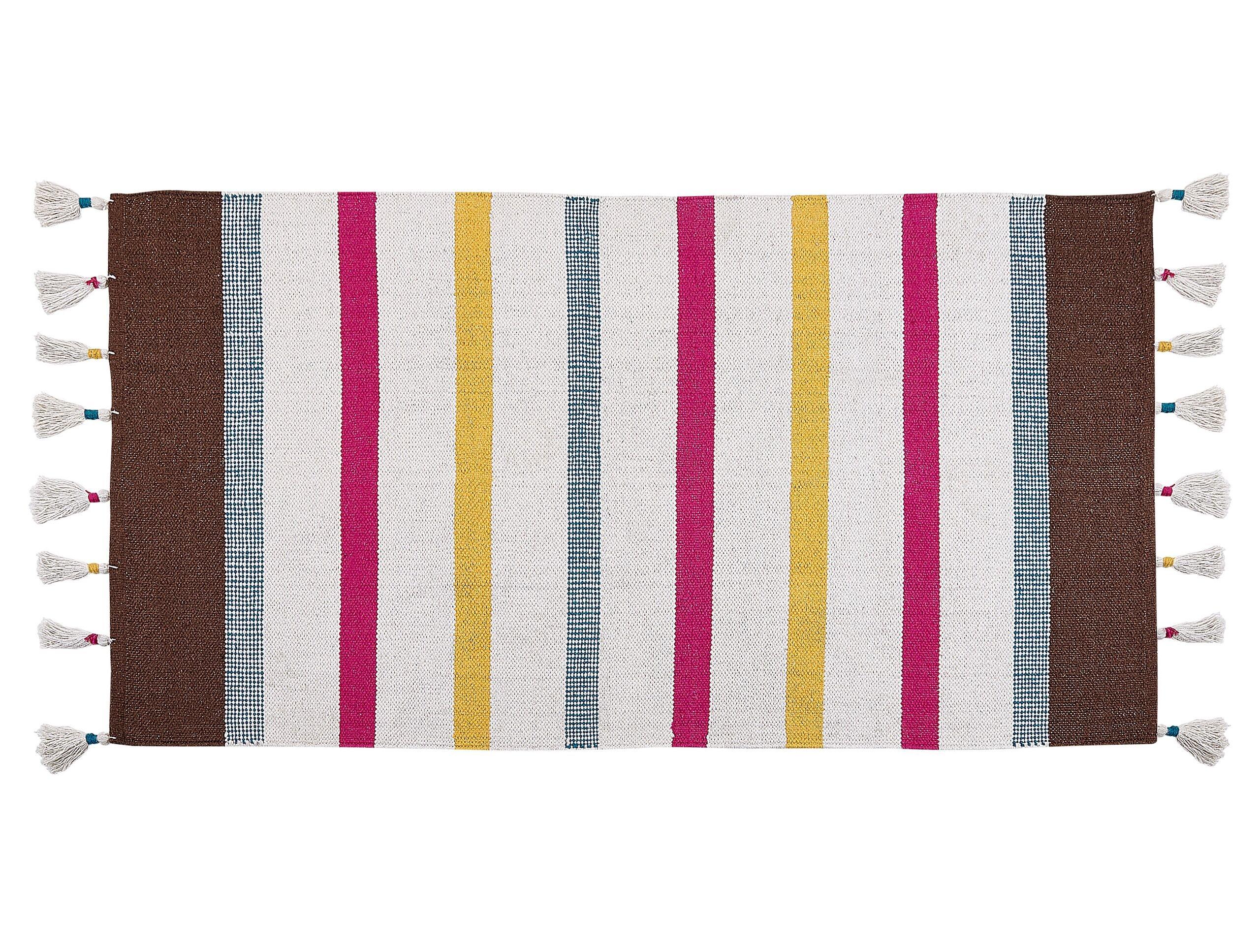 Tappeto con strisce multicolori. Ravviva ogni stanza con stile, con questo coloratissimo tappeto. Realizzato a mano in soffice ma durevole cotone di altissima qualità, è la scelta ideale per la cameretta, per il soggiorno o la camera da letto, per un autentico tocco di vitalità. Le preziose righe e le splendide nappe decorative, infine lo rendono un vero colpo d'occhio.