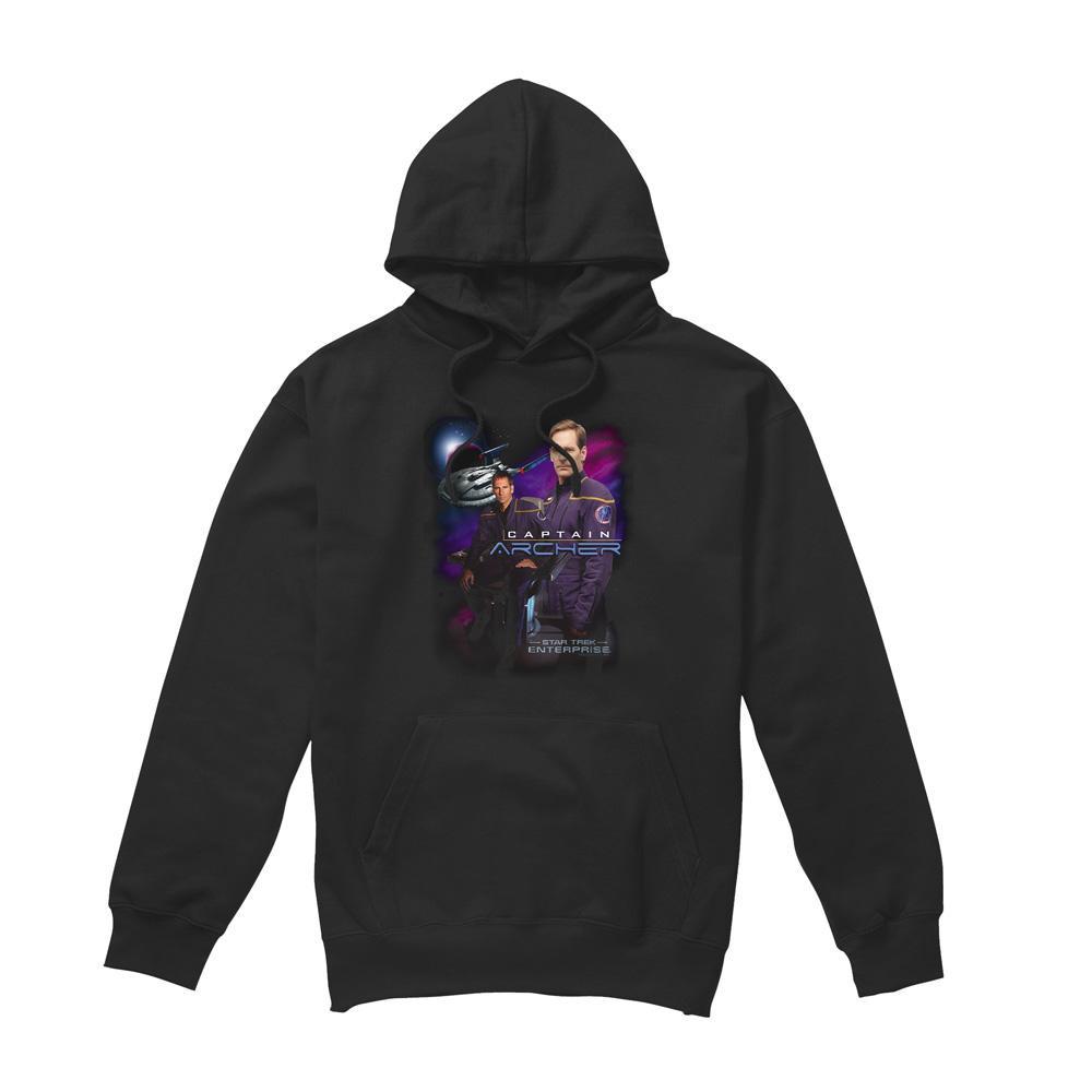 Questa felpa con cappuccio presenta una stampa grafica sul davanti, che mostra il Capitano Archer e l'Enterprise di Star Trek. È progettata per il comfort e l'abbigliamento casual, rendendola un'aggiunta versatile a qualsiasi guardaroba.