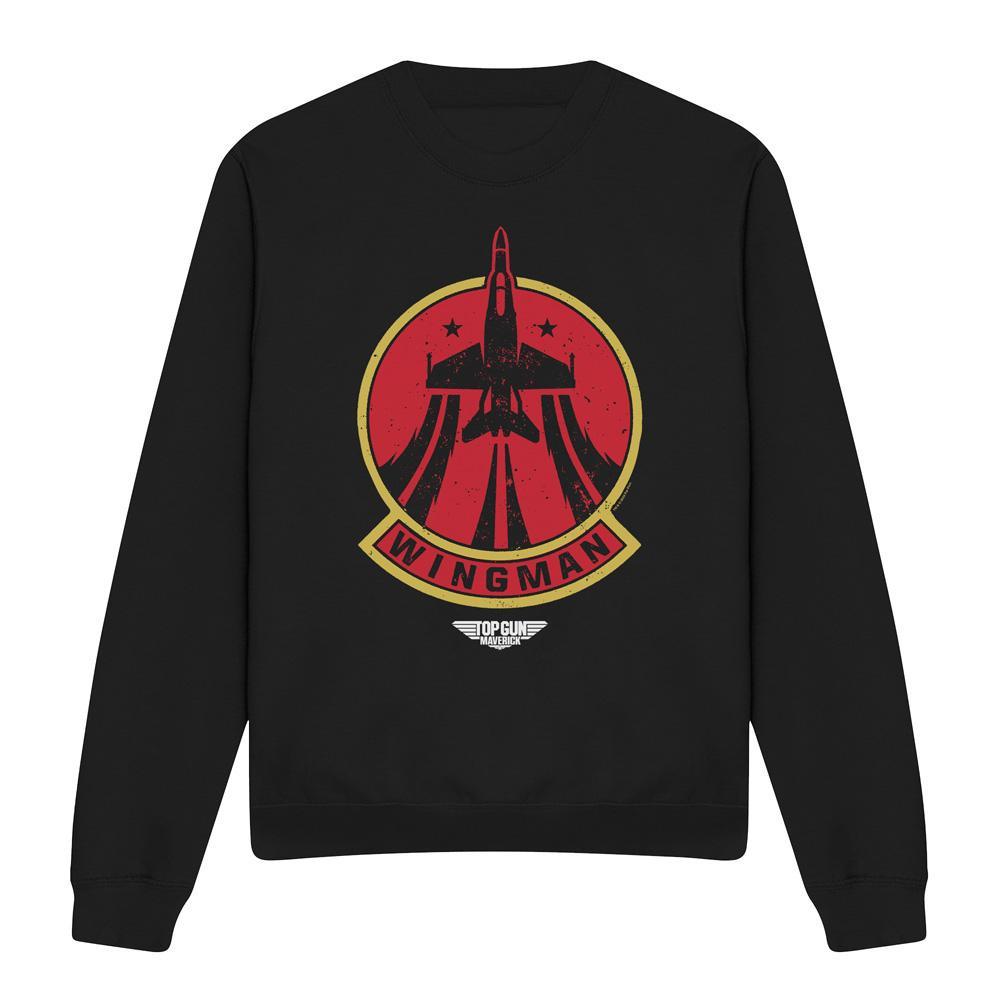 La felpa Wingman presenta un classico design a girocollo, offrendo un'aggiunta comoda e versatile a qualsiasi guardaroba. La parte anteriore della felpa è adornata con una grafica distintiva, che mostra un jet da combattimento in decollo, circondato da un audace emblema rosso e giallo con la parola "WINGMAN" ben visibile in basso. Sotto l'emblema, il logo "TOP GUN MAVERICK" è visibile, aggiungendo un tocco autentico.