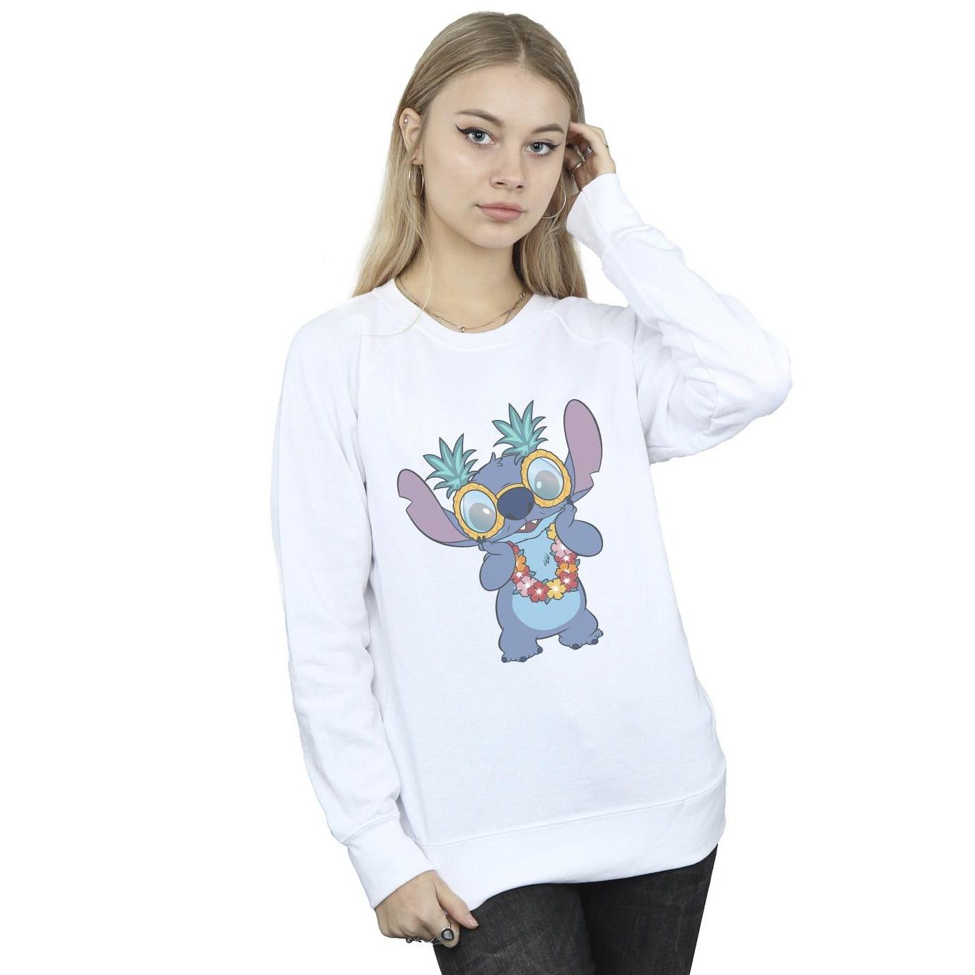 Questa felpa presenta una stampa grafica giocosa di Stitch di Lilo & Stitch della Disney, adornato con occhiali a forma di ananas e una lei floreale, che porta un tocco di divertimento tropicale a qualsiasi guardaroba. Il classico girocollo e le maniche lunghe offrono una vestibilità comoda e versatile.