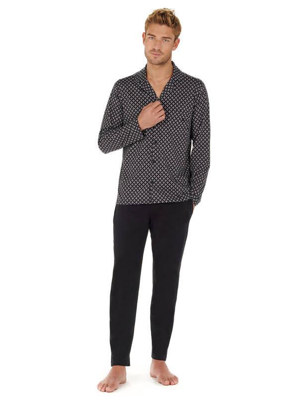 Il set pigiama Vince offre comfort e stile per serate rilassanti. Il top presenta un colletto classico e un'abbottonatura frontale, impreziosito da un sottile motivo geometrico. Le maniche lunghe offrono calore, mentre i pantaloni a tinta unita completano il look con una cintura elastica per una vestibilità confortevole.