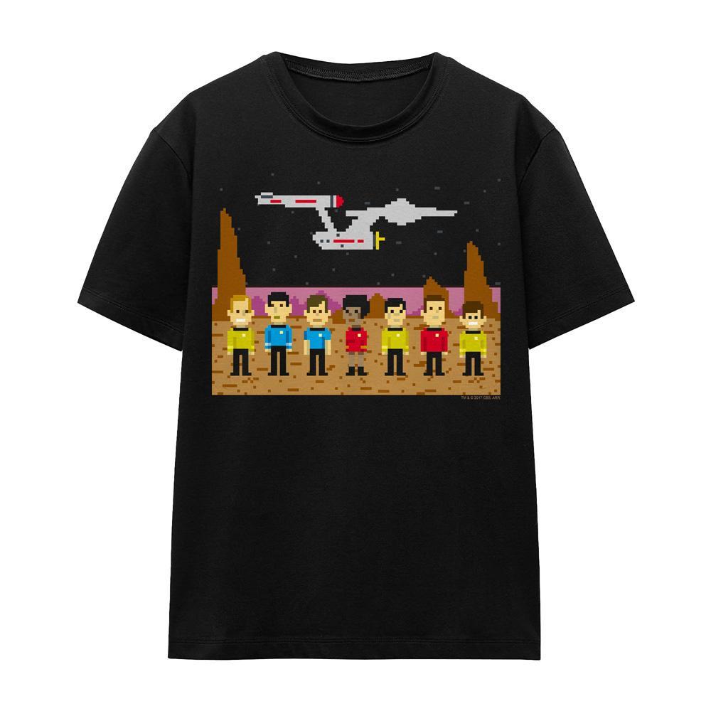 Questa T-shirt presenta una grafica pixelata unica ispirata a "The Original Series". Il design mostra personaggi iconici e un'astronave in stile retrò a 8 bit, rendendola un'aggiunta distintiva a qualsiasi guardaroba.