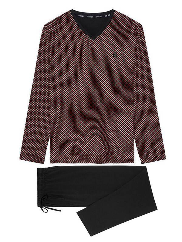 Il set pigiama Murray offre comfort e stile per notti riposanti. Il top a maniche lunghe presenta un motivo sottile e uno scollo a V, mentre i pantaloni lunghi in tinta unita coordinati assicurano una vestibilità rilassata.