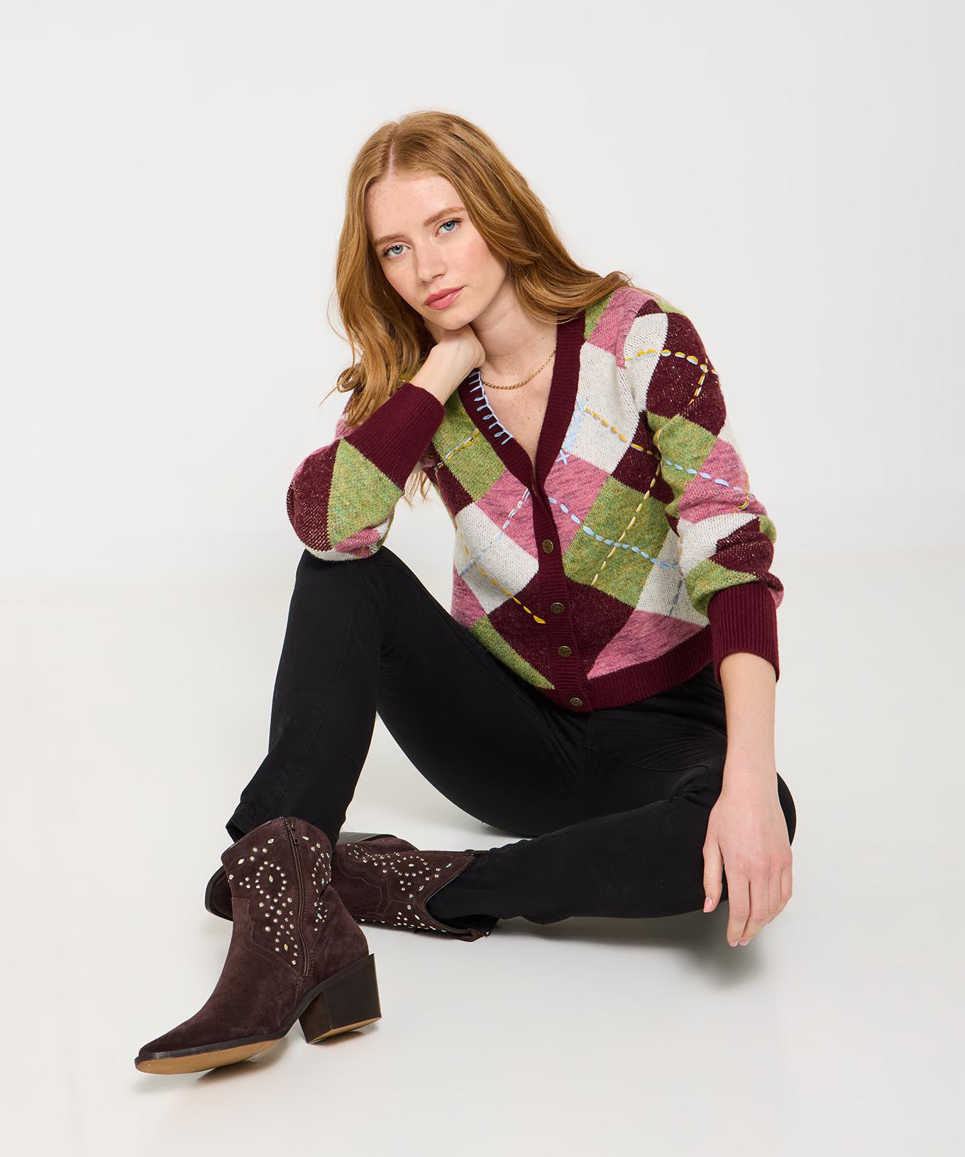 Questo classico cardigan in maglia argyle offre un look intramontabile ma alla moda. Il design presenta uno scollo a V e un'abbottonatura completa, rendendolo un'aggiunta versatile a qualsiasi guardaroba. L'intricato motivo argyle è completato da sottili dettagli ricamati, che aggiungono un tocco di fascino unico.