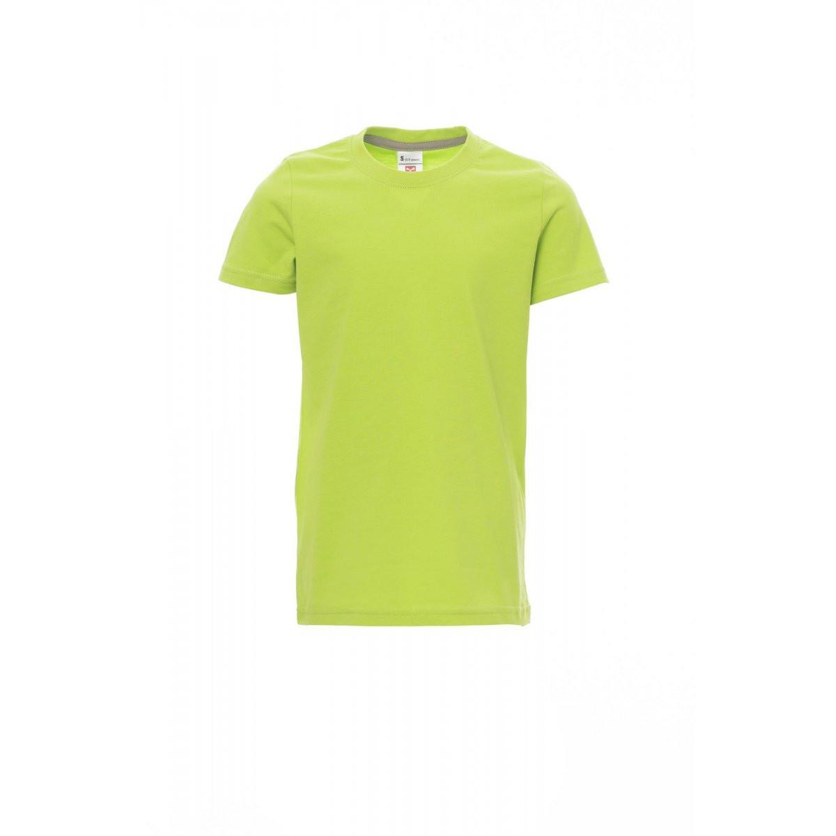 T-shirt per bambini, scollo basso e maniche corte, colletto a costine in misto spandex da 1,5 cm con cucitura anteriore ripiegata, nastro di rinforzo da spalla a spalla in colore contrastante sul colletto, cuciture elastiche, struttura tubolare (colore mimetico con cucitura laterale)
