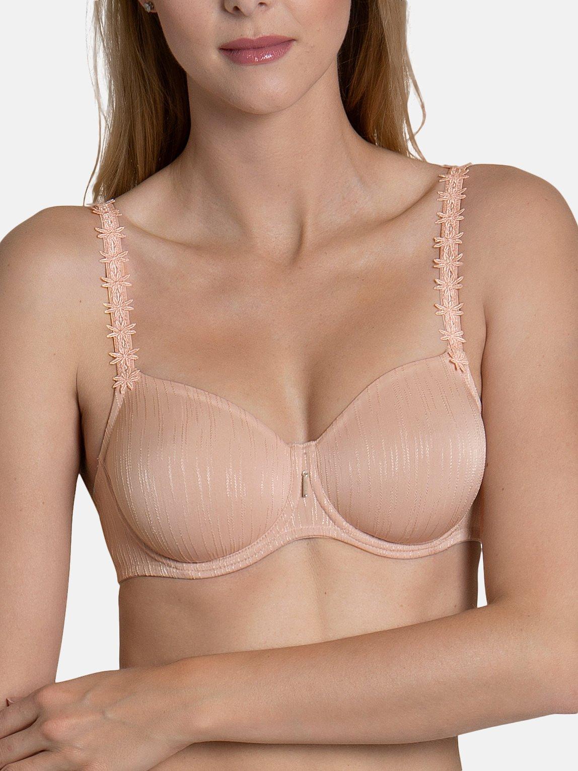 Le coppe sono realizzate in modo impeccabile, rendendo questo reggiseno perfetto per essere indossato sotto qualsiasi vestito. L'interno delle coppe è realizzato in tessuto a maglia liscio ma resistente, per una forma e un sostegno migliori. Anche la parte posteriore è foderata con tulle elastico per una migliore avvolgenza e un maggiore comfort nelle taglie più grandi. Un elastico sotto il seno assicura una vestibilità perfetta. Un design più ricco nella parte centrale del reggiseno avvolge meglio il petto. Le spalline sono regolabili per una vestibilità confortevole, e un piccolo gioiello decorativo è posizionato tra le coppe.
