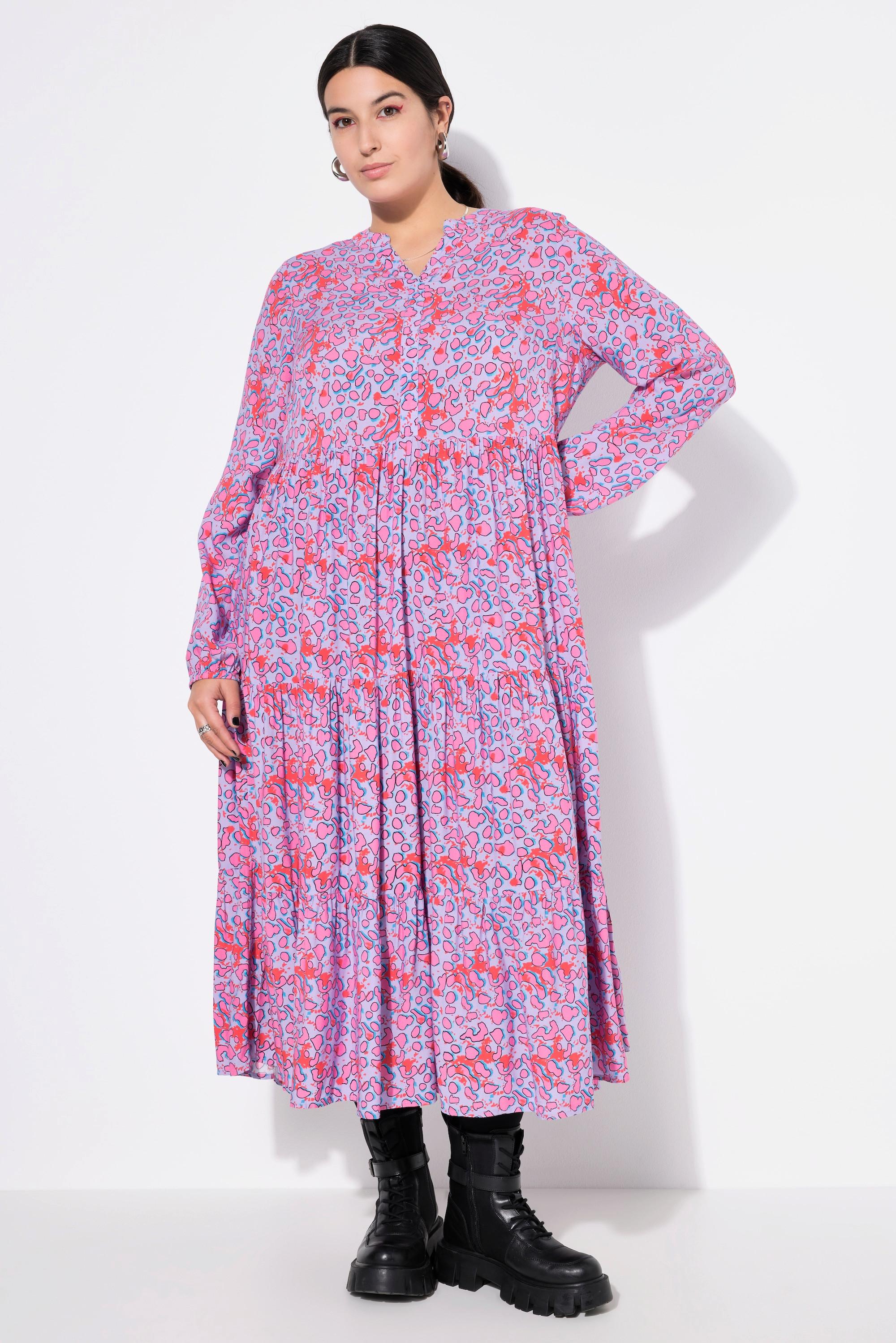 Questo maxi abito presenta una vivace stampa color-leo e volant giocosi, creando un look elegante e accattivante. Le maniche lunghe e il design a balze offrono una silhouette comoda e fluida, perfetta per varie occasioni.
