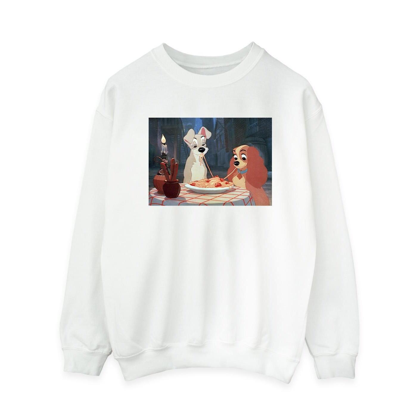 Questa felpa presenta un classico design a girocollo e maniche lunghe, offrendo una vestibilità comoda e rilassata. La parte anteriore è adornata con una deliziosa stampa grafica di Lilli e il Vagabondo che condividono una cena a base di spaghetti, catturando un amato momento cinematografico.