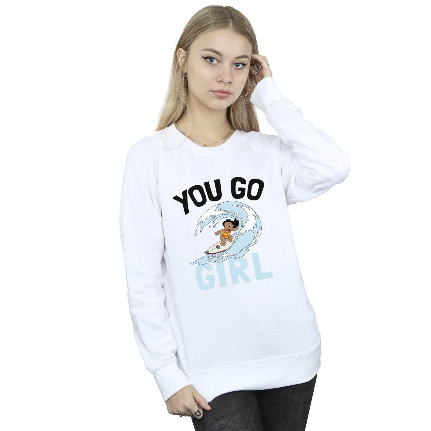 Questa felpa presenta una stampa grafica giocosa con il testo "YOU GO GIRL" e un personaggio che fa surf su un'onda. È progettata con maniche lunghe e un comodo girocollo, rendendola un'aggiunta versatile a un guardaroba casual.