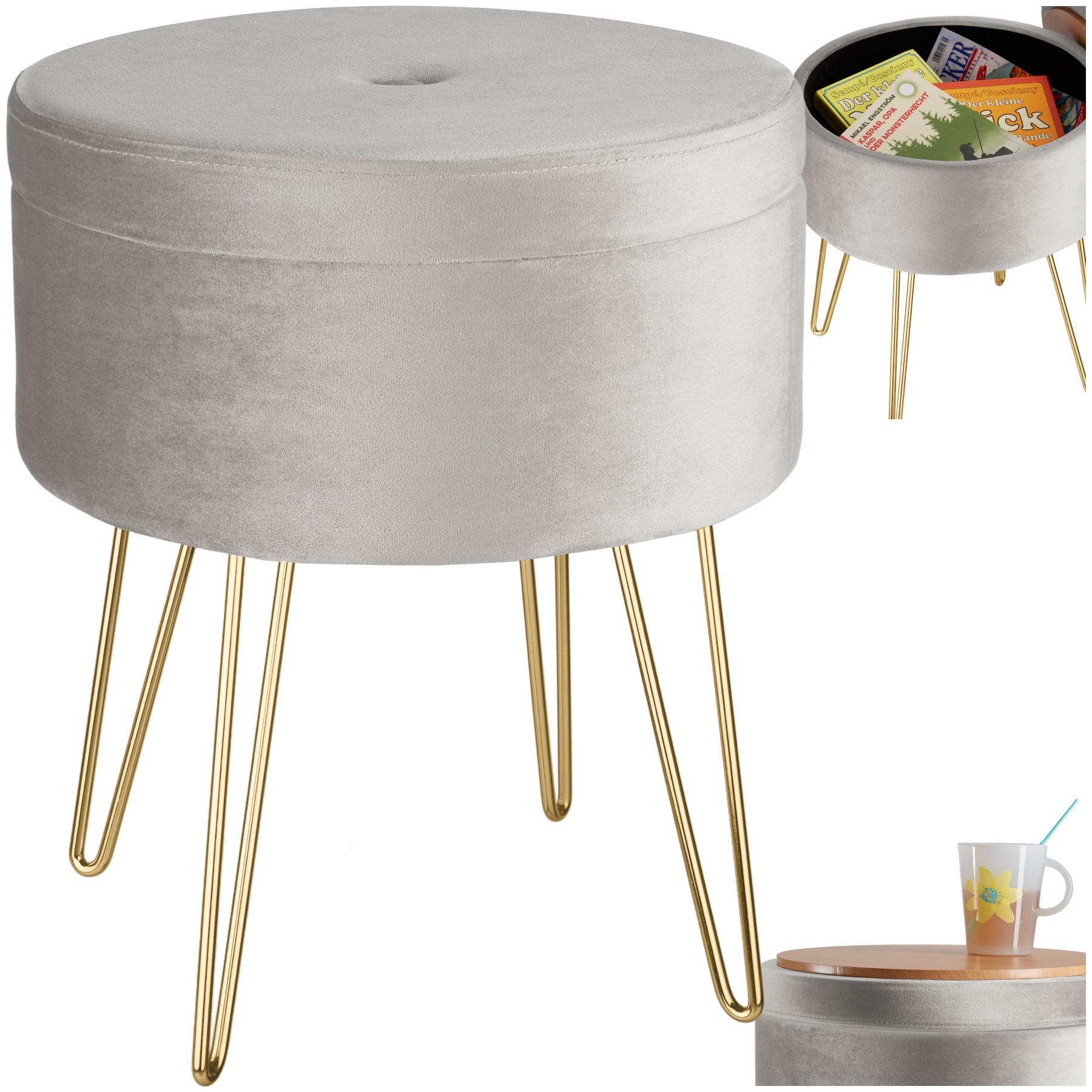 Con lo sgabello Ava di tectake ti assicurerai una attrazione che contiene più vantaggi in uno. Lottima imbottitura e la superficie in velours rendono questo bel complemento darredo un vero morbido piacere alla vista. Oltre allottica in filigrana questa costruzione ponderata possiede qualità pratiche come una grande resistenza e uno scomparto integrato. Grazie al suo aspetto gradevole questo sgabello rotondo di grande stile potrà essere utilizzato dovunque davanti alla toeletta in camera da letto o come seduta aggiuntiva in salotto.