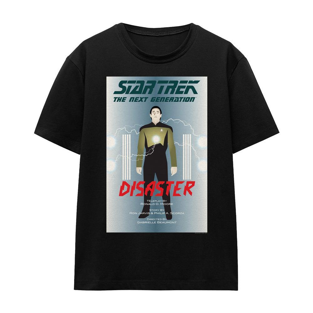Questa T-shirt presenta una stampa grafica ispirata a Star Trek: The Next Generation Stagione 5, Episodio 5, intitolato "Disaster". Il design mostra una rappresentazione stilizzata del Capitano Picard nella sua uniforme della Flotta Stellare, circondato da elementi che ricordano la trama dell'episodio, inclusi fulmini e danni strutturali. Il titolo dell'episodio "Disaster" è prominentemente visualizzato in rosso, insieme ai crediti per la sceneggiatura, la storia e la regia.