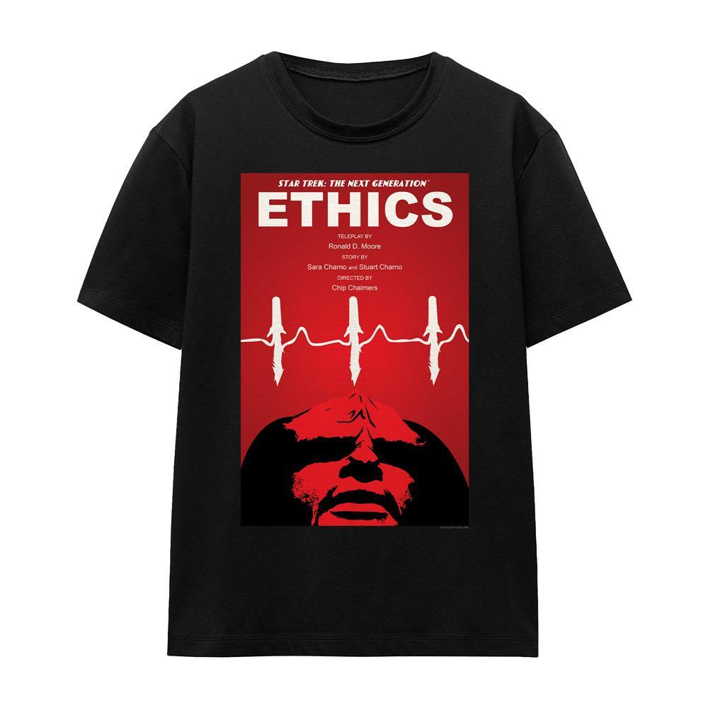 Questa T-shirt presenta una stampa grafica ispirata a "Ethics", stagione 5 episodio 16 di Star Trek: The Next Generation. Il design cattura l'essenza dell'episodio con una rappresentazione visiva audace.