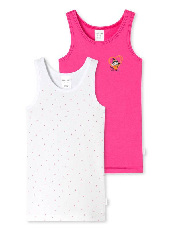 Canotte da bambina in una pratica confezione doppia, rosa con il motivo di Cat Zoe come strega e bianco con piccole stelle rosa