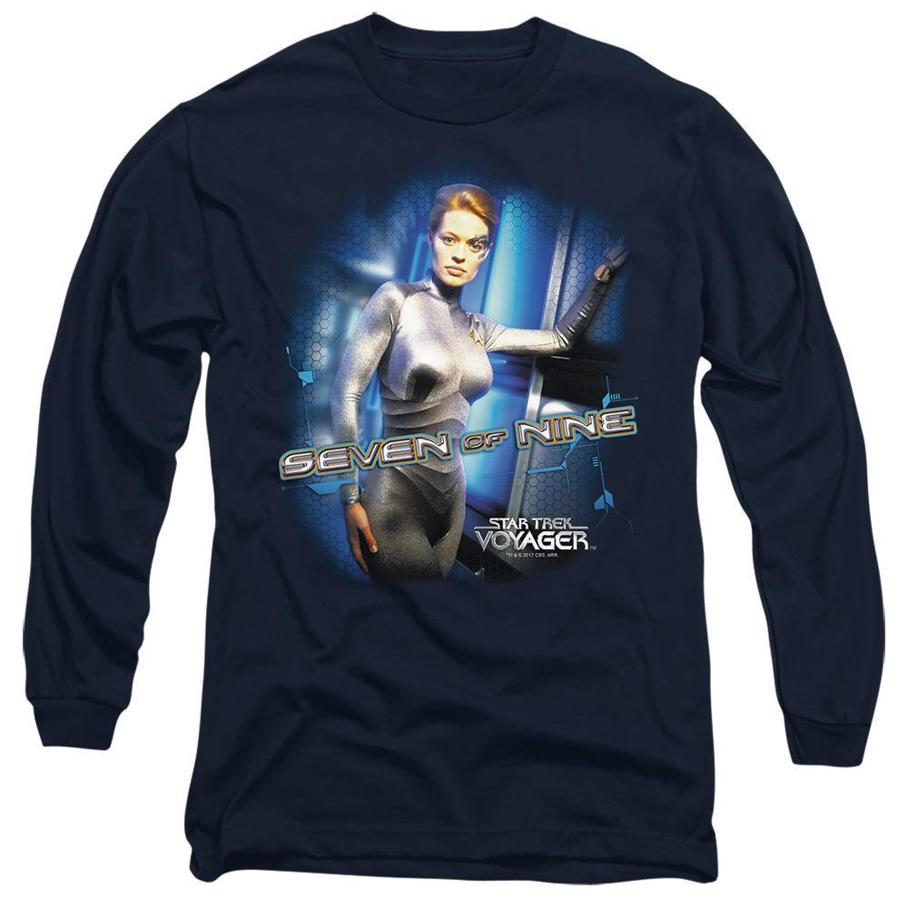 Questa t-shirt a maniche lunghe presenta una sorprendente stampa grafica di Seven of Nine di Star Trek: Voyager. Il design cattura l'iconico personaggio nella sua distintiva uniforme argentata, su uno sfondo blu futuristico con motivi esagonali. La maglietta è una scelta confortevole per i fan della serie.
