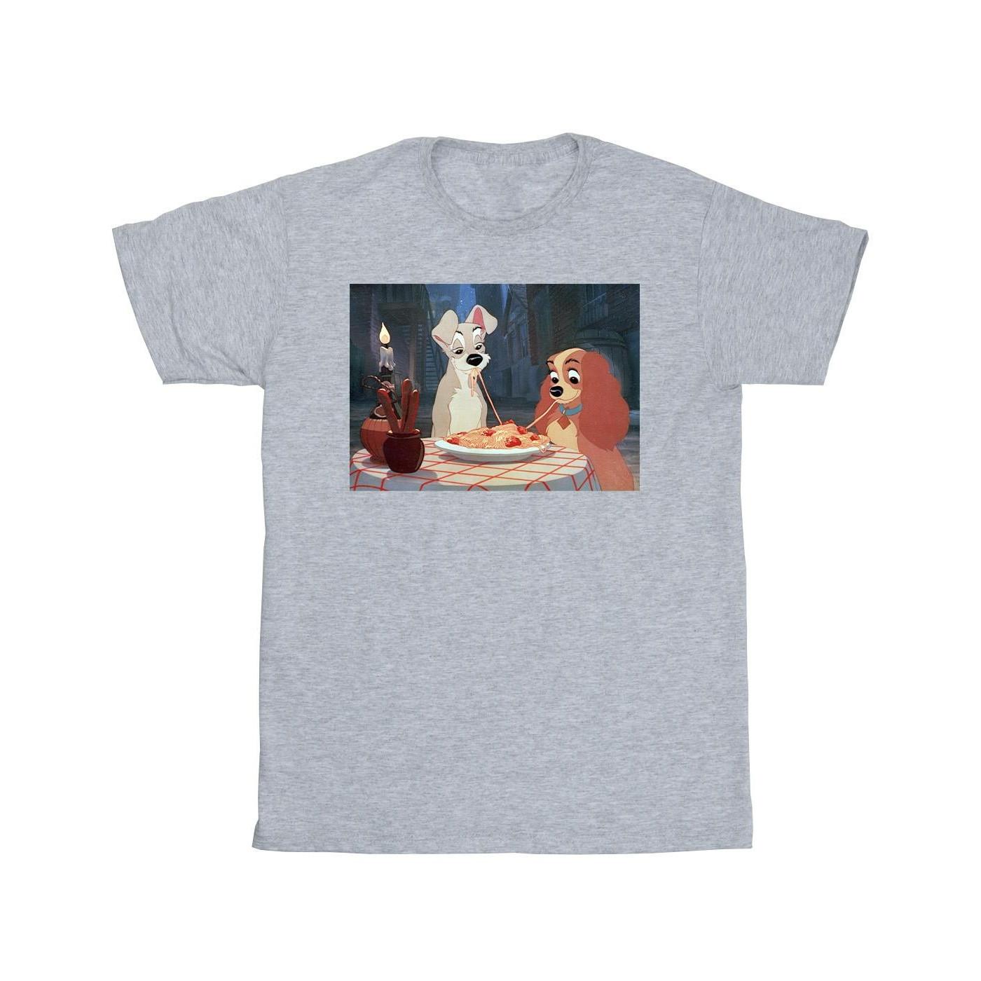 Questa T-shirt presenta un'affascinante stampa grafica di Lilli e il Vagabondo che condividono una romantica cena a base di spaghetti, catturando un classico momento cinematografico. Il design è posizionato centralmente sulla parte anteriore della maglietta, offrendo un'estetica nostalgica e accattivante.