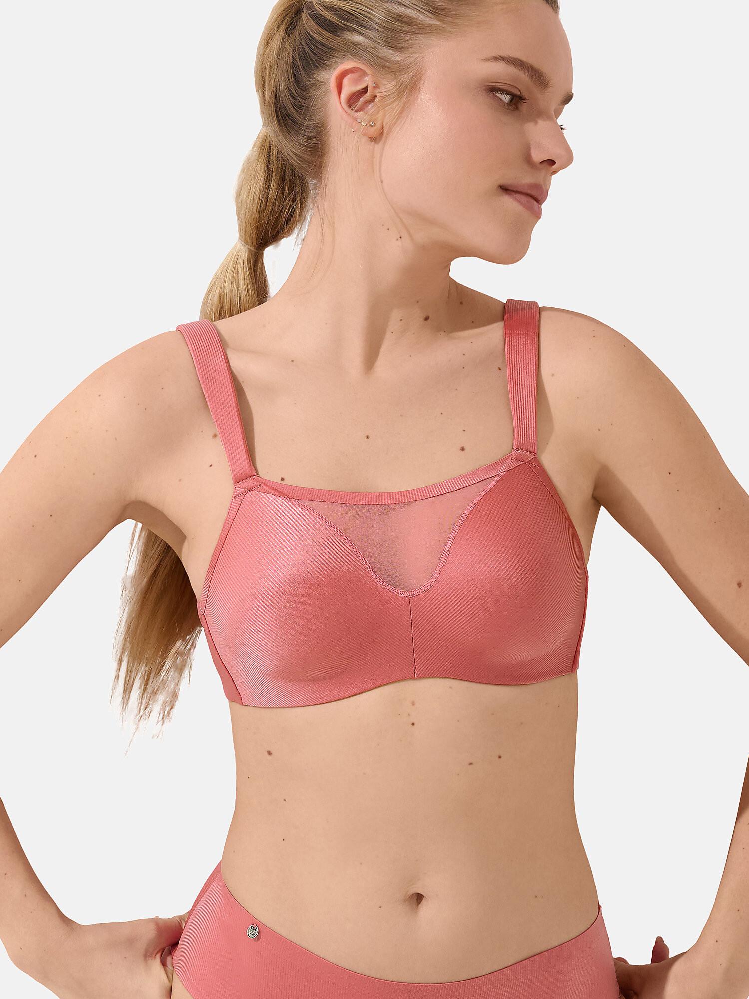 Reggiseno preformato con ferretto della collezione Lifestyle di Lisca, adatto alle taglie forti, con coppe imbottite funzionali e senza ferretto. La scollatura è alta con un inserto in tulle che avvolge il décolleté e ne migliora la funzionalità durante le varie attività. Come tutte le altre rifiniture, la scollatura è rifinita con un sottile piping incollato. Le spalline più larghe sono foderate in schiuma sul davanti e regolabili senza soluzione di continuità sul retro. La schiena è ampia, con una combinazione di tulle e tessuto bifoderato.