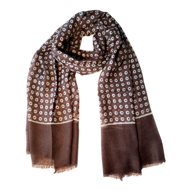 In un caldo marrone con discreti pois crema e neri, questa sciarpa in 100% lana merino è un accessorio versatile per donne e uomini. Ideale per tutti i tipi di giacche e cappotti invernali, così come per stili casual, aggiunge allo stesso tempo un tocco rilassato agli outfit formali. Un must-have che unisce stile e comfort con eleganza.