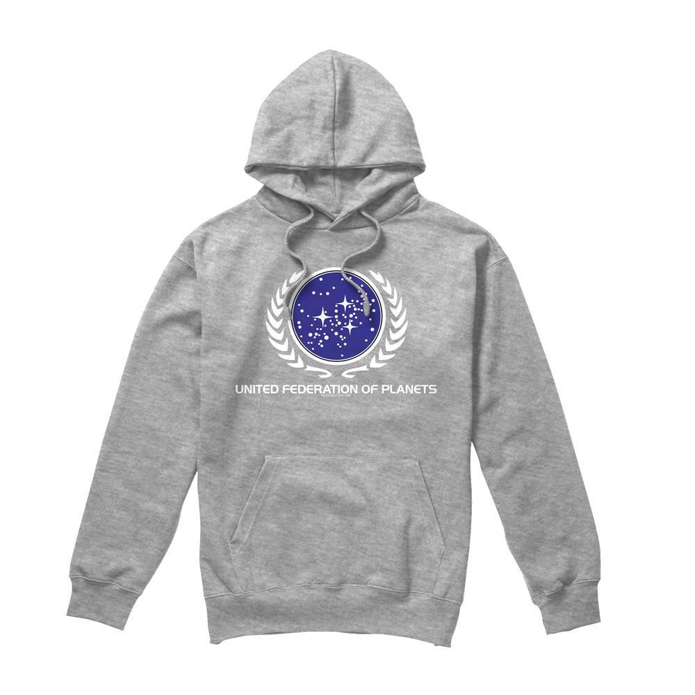 Questa felpa con cappuccio presenta un design classico con una spaziosa tasca frontale e un cappuccio regolabile. La parte anteriore è adornata con una stampa grafica del logo "United Federation of Planets", rendendola un capo distintivo per i fan.