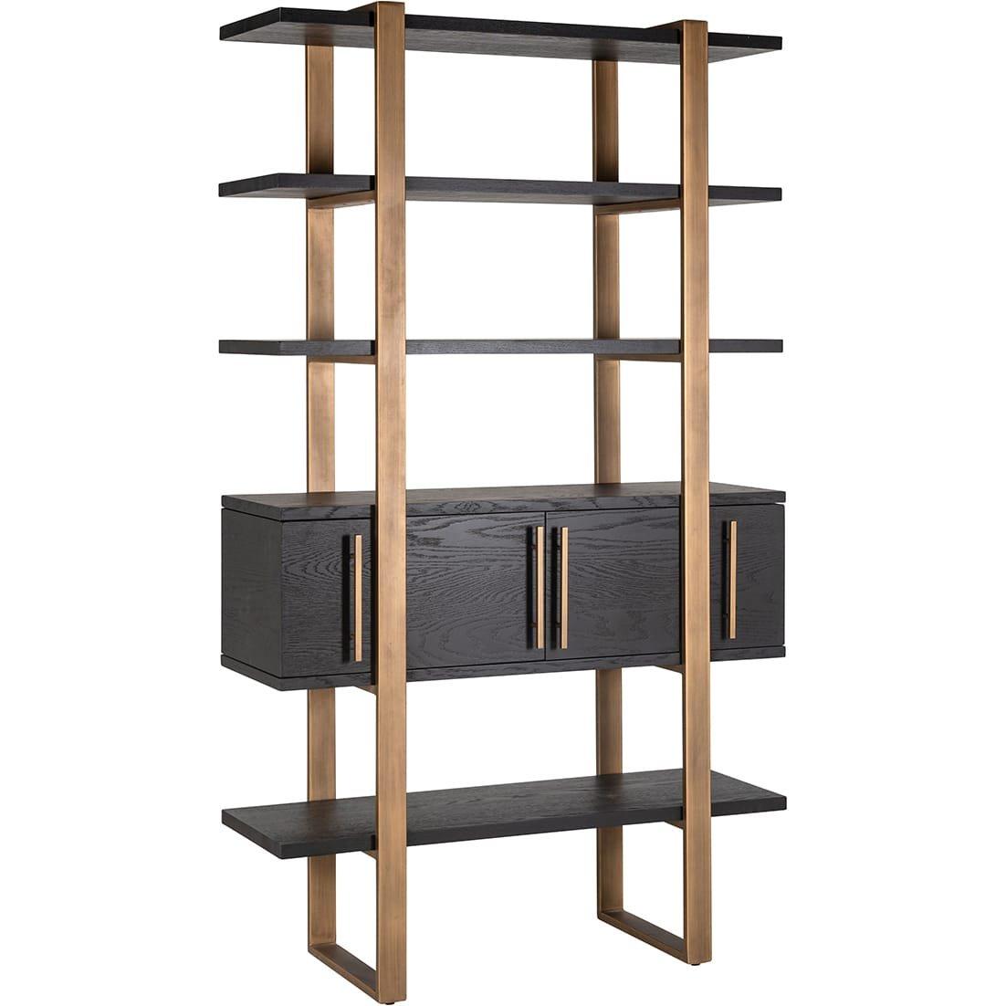 Metallo di alta qualità e impiallacciatura di quercia Elegante colore marrone scuro Accenti in oro spazzolato Quattro ante per ulteriore spazio di archiviazione Quattro mensole a muro per la decorazione Design elegante e funzionale Perfetto per gli interni moderni