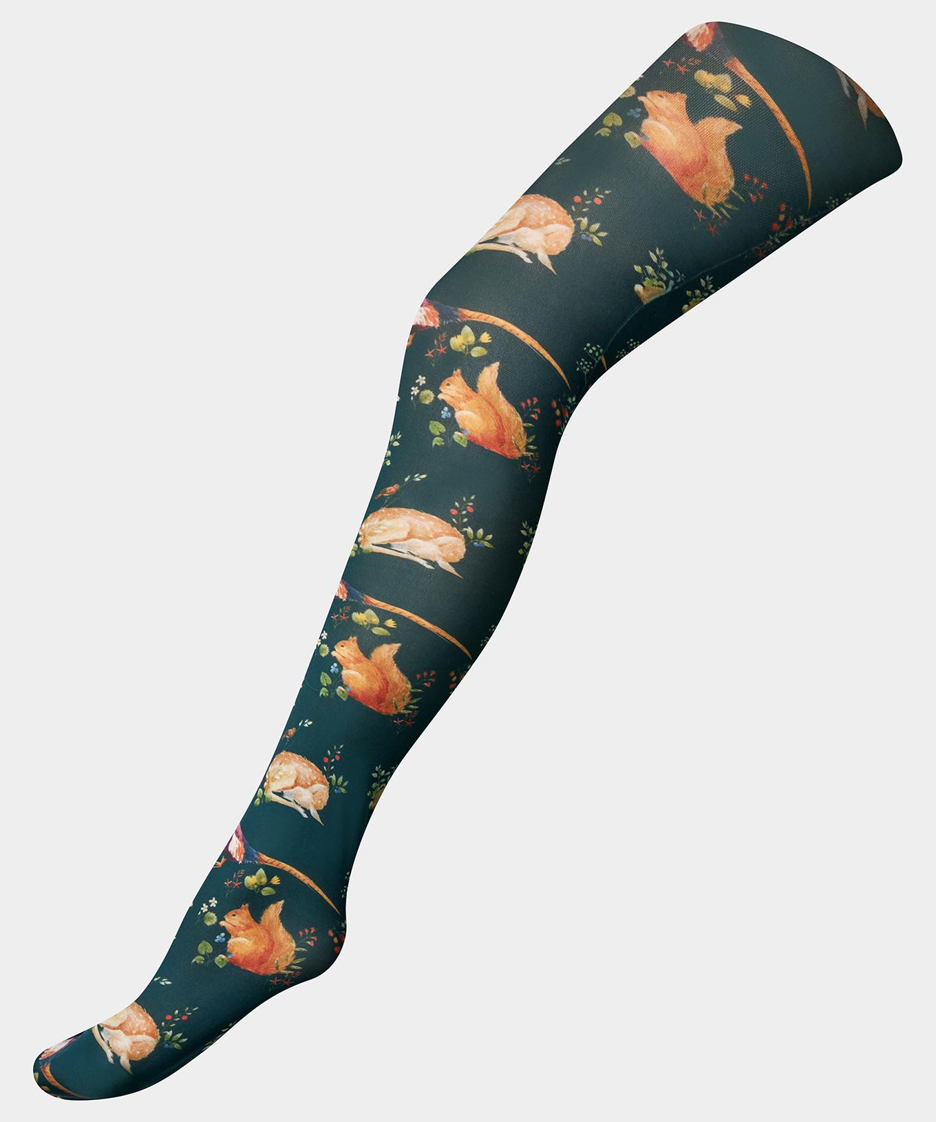 Questi collant da 50 denari con una deliziosa stampa boschiva aggiungono un tocco stagionale, perfetti per valorizzare gli outfit autunnali. Il design presenta vari elementi del bosco, creando un look fantasioso e accattivante.