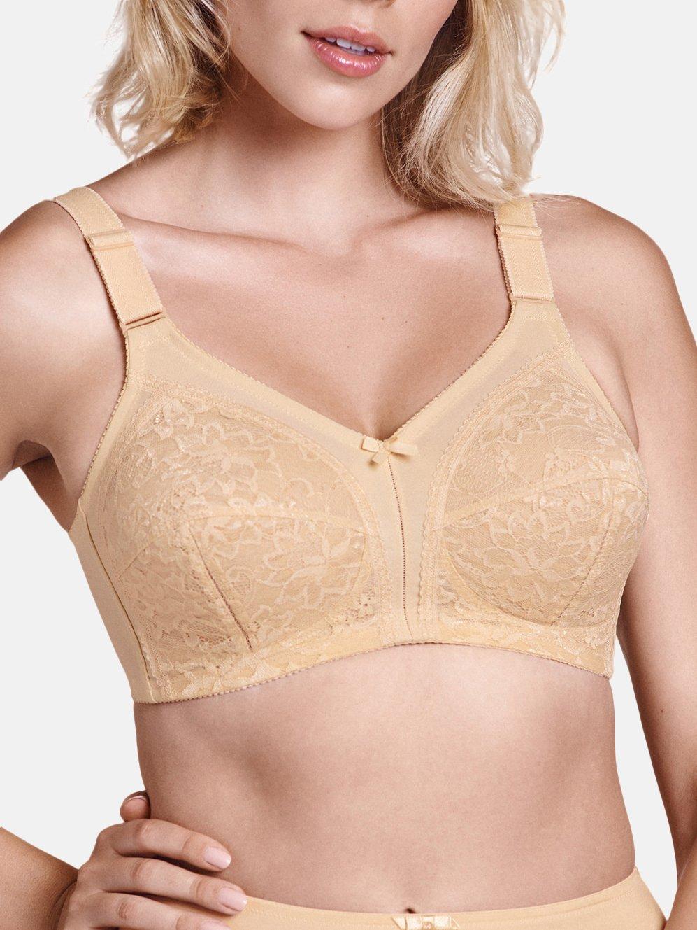 Coppe con ferretto per un sostegno ottimale del seno, spalline più larghe per un uso confortevole. Le spalline scorrono sul davanti per una facile regolazione della lunghezza, il taglio elastico della coppa offre una migliore vestibilità, coprendo completamente il seno e minimizzandolo otticamente. Il supporto sui lati garantisce la fermezza.