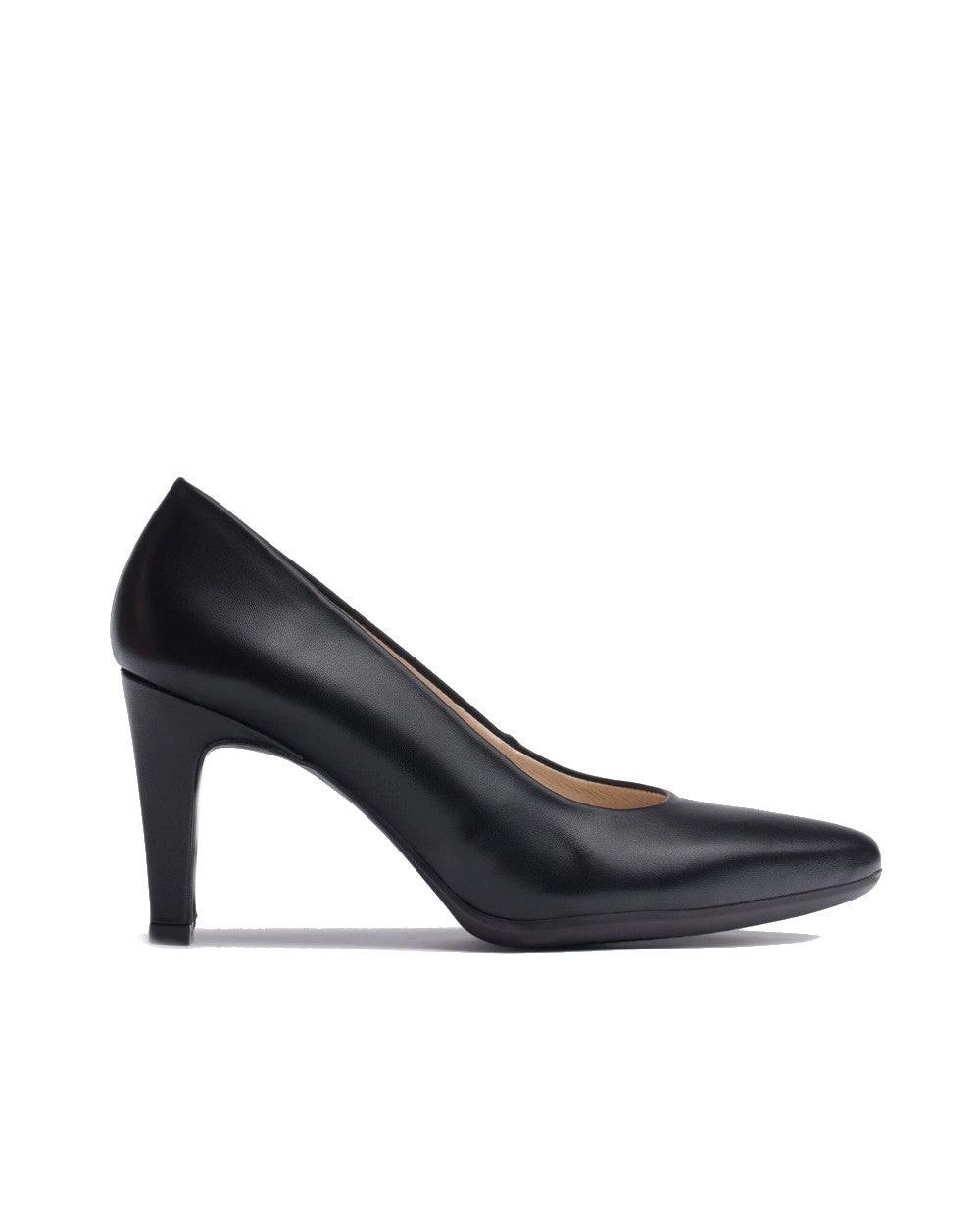Scarpa da donna con tacco alto in pelle nera. Questa scarpa in stile "retrò" ha la punta a punta, il tacco sottile e il cinturino posteriore con chiusura con fibbia regolabile. La soletta MemoryGel ammortizza ogni tuo passo. Meraviglie comfort e stile garantiti.