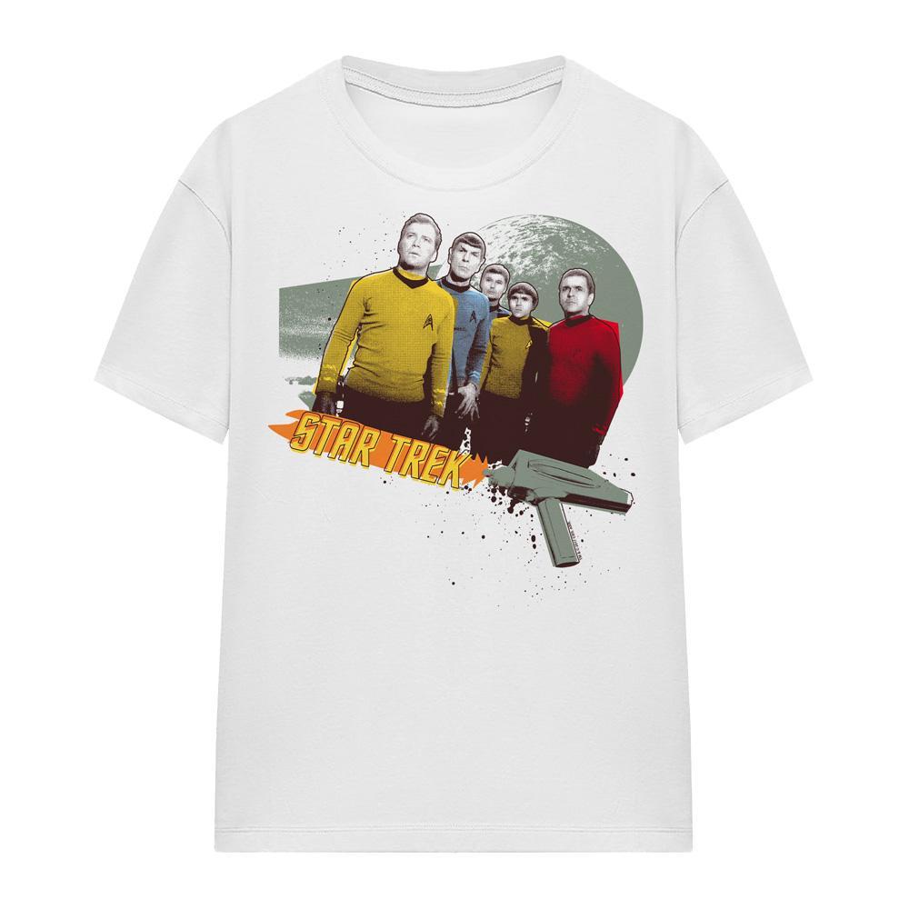 Questa T-shirt presenta un classico girocollo e maniche corte, offrendo una vestibilità comoda e versatile. La parte anteriore è decorata con una stampa grafica ispirata a "Star Trek: Strange New Worlds", che mostra personaggi e immagini iconiche della serie.