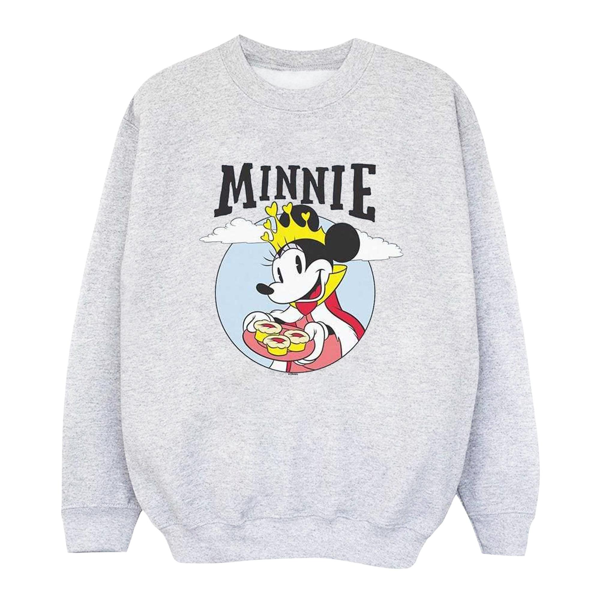 Questa felpa presenta un'incantevole stampa grafica di Minnie Mouse, rendendola un'aggiunta deliziosa a qualsiasi guardaroba casual. Il design mostra Minnie Mouse che indossa una corona e tiene un vassoio di dolcetti, su un cerchio azzurro con nuvole, e la parola "MINNIE" è ben visibile sopra.