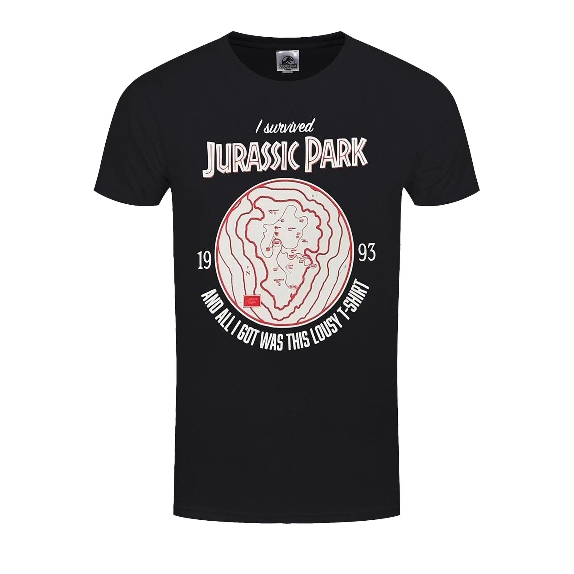 Questa T-shirt presenta una stampa grafica unica che cattura l'essenza dell'iconico film Jurassic Park. Il design include un'illustrazione simile a una mappa con il testo "I survived Jurassic Park" e "And all I got was this lousy T-shirt" insieme all'anno 1993, che commemora l'uscita del film. Il classico girocollo e le maniche corte la rendono un'aggiunta versatile a qualsiasi guardaroba casual.
