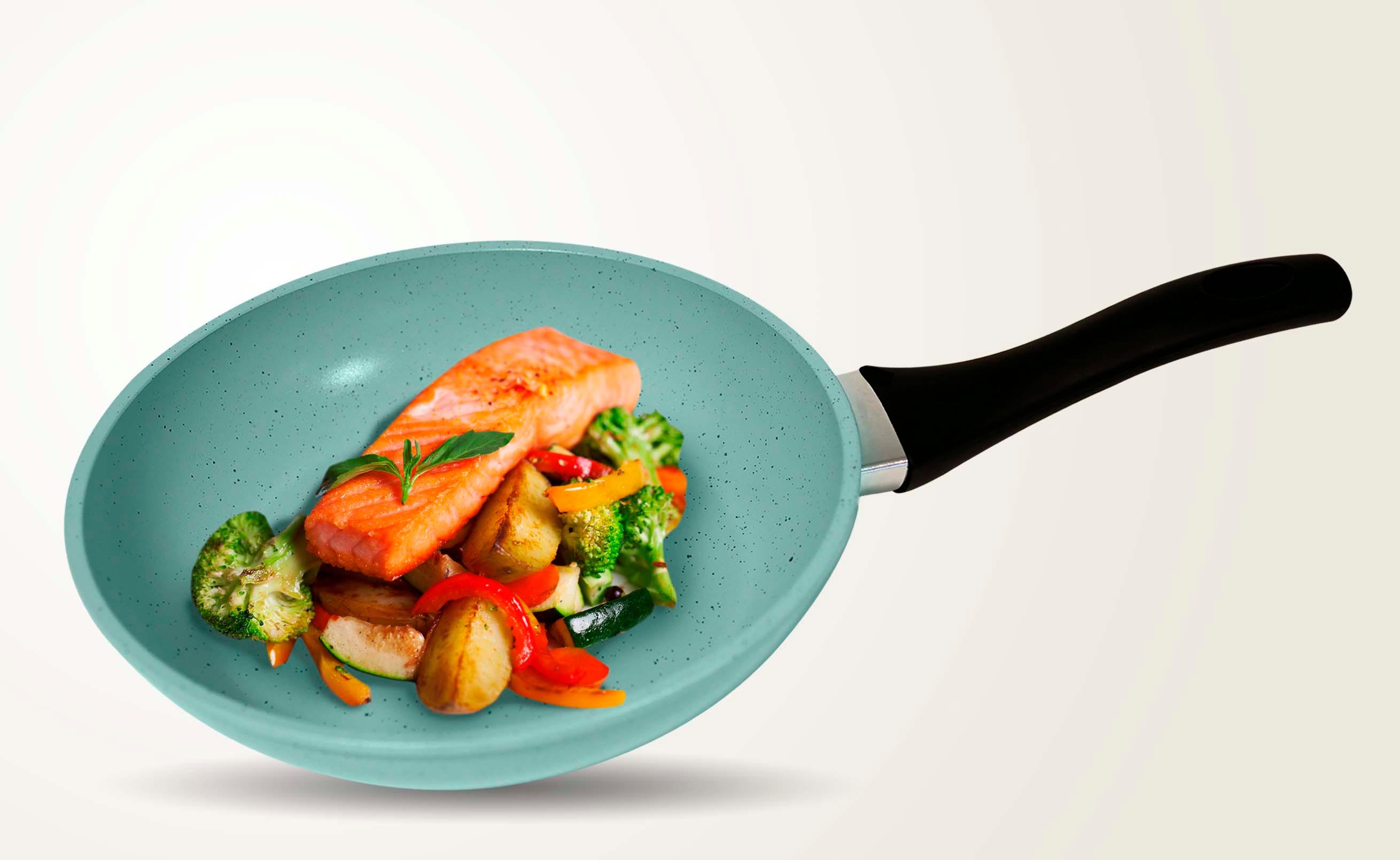 Rivestimento antiaderente a tre strati Friggi con la resistenza della giada Senza PFOA e PFOS, per una cottura sana Tecnologia Scratch Resistant per la massima durata Adatta a tutti i piani cottura, inclusa l'induzione Facile da pulire e ideale per l'uso quotidiano