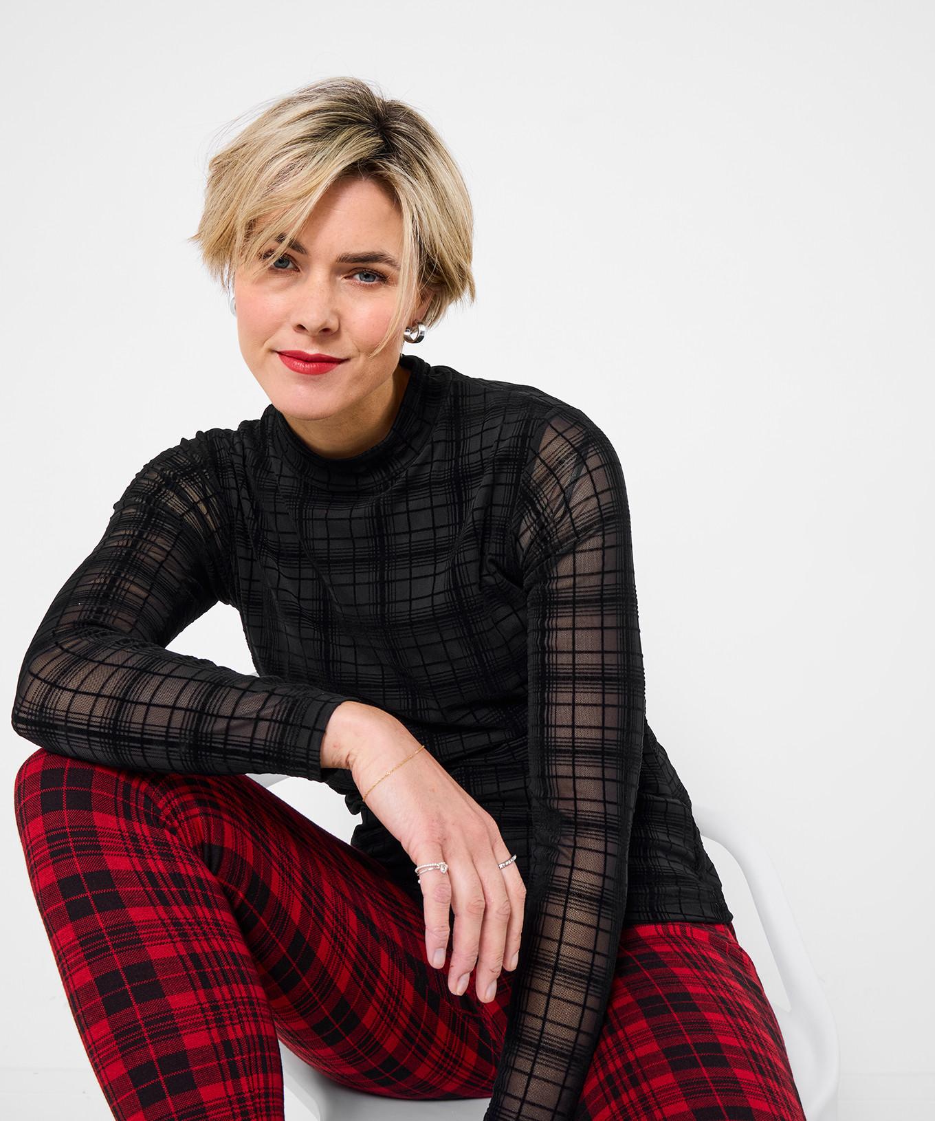 Questo top in jersey slim fit presenta un elegante design in rete a quadri, offrendo un look moderno e chic. Il collo alto e le maniche lunghe creano una silhouette slanciata, rendendolo un capo versatile per diverse occasioni.