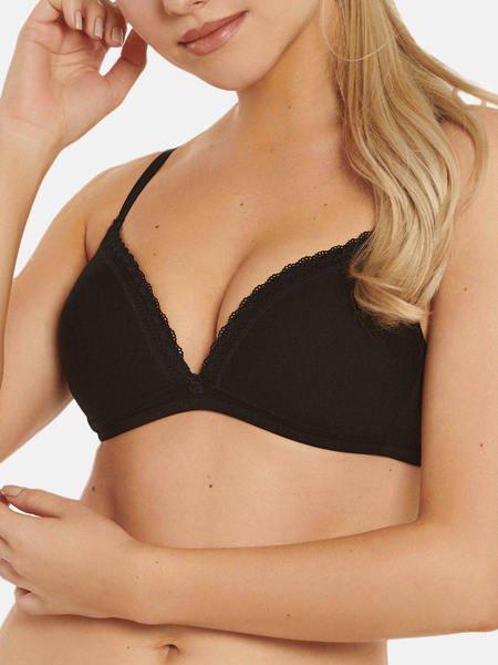 Reggiseno Young con coppe in schiuma dal taglio a triangolo, senza ferretto per un comfort ottimale. Fine pizzo decorativo vintage lungo le coppe. Morbido al tatto all'interno delle coppe. La fascia di chiusura e le spalline sono regolabili e più larghe nelle taglie più grandi. Delicato intimo in cotone, indispensabile per chi preferisce i materiali naturali. Un modello morbido, semplice e allo stesso tempo femminile, ideale per essere indossato tutti i giorni. Le raffinate rifiniture in pizzo richiamano i dettagli romantici del vintage. Minimalista, naturale e pratico.