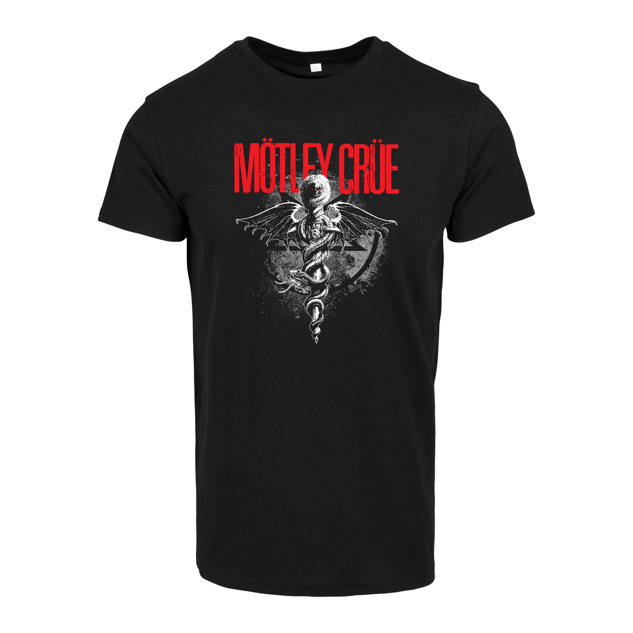 Questa maglietta presenta un classico girocollo e maniche corte, offrendo una vestibilità comoda e versatile. La parte anteriore è adornata da una stampa grafica distintiva, che mostra l'iconico logo dei Motley Crue in rosso sopra un dettagliato design simile a un caduceo con ali e un serpente, il tutto su uno sfondo circolare invecchiato.