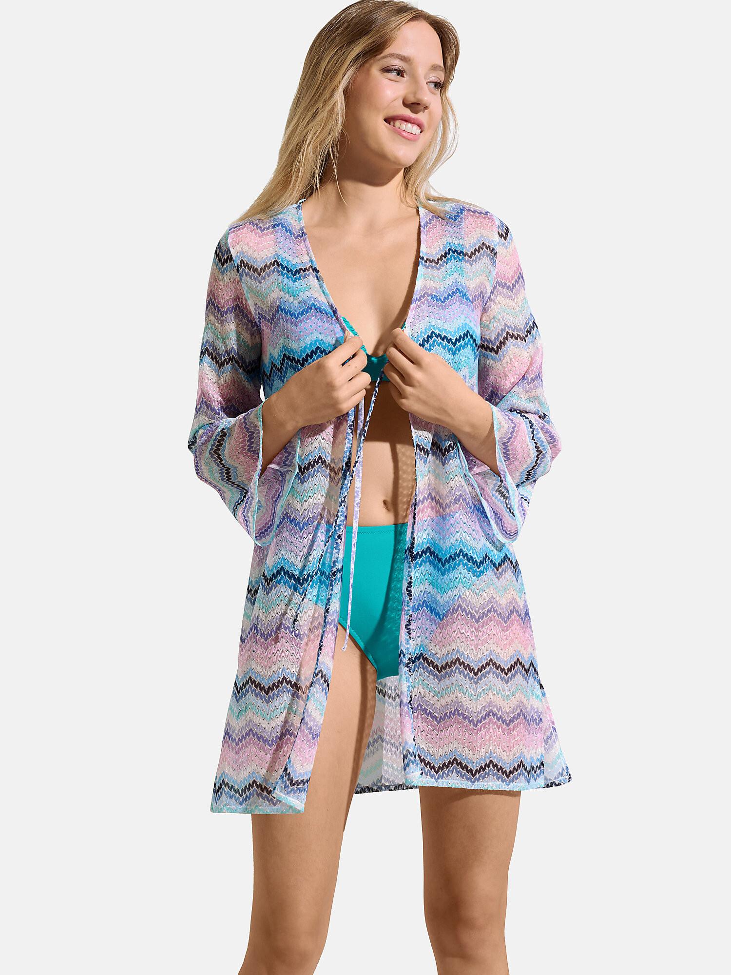 Questi capi sono realizzati in una maglia fine e leggera, con un motivo giovanile a zig zag. Disponibile nelle rinfrescanti tonalità del blu e del viola. Da abbinare all'infinito con i costumi da bagno in spiaggia, al bar della piscina o con i vostri outfit estivi.