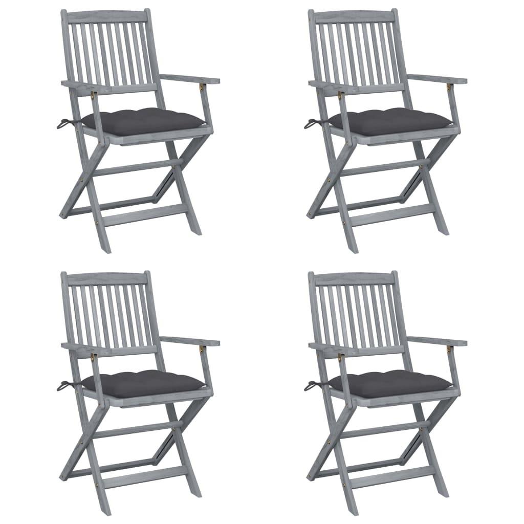 Queste sedie da pranzo sono realizzate in legno massello di acacia, un legno tropicale, che le rende resistenti agli agenti atmosferici e durevoli per anni di utilizzo. Il legno massello di acacia ha la forza di sopportare il peso e di resistere all'usura del tempo. La superficie grigio slavato è facile da pulire con un panno umido. Le sedie possono essere piegate per risparmiare spazio quando non vengono utilizzate. Inoltre, i cuscini inclusi offrono un comfort extra mentre ci si rilassa o si pranza. Ogni cuscino è dotato di due set di corde per poter essere fissato saldamente alla sedia.