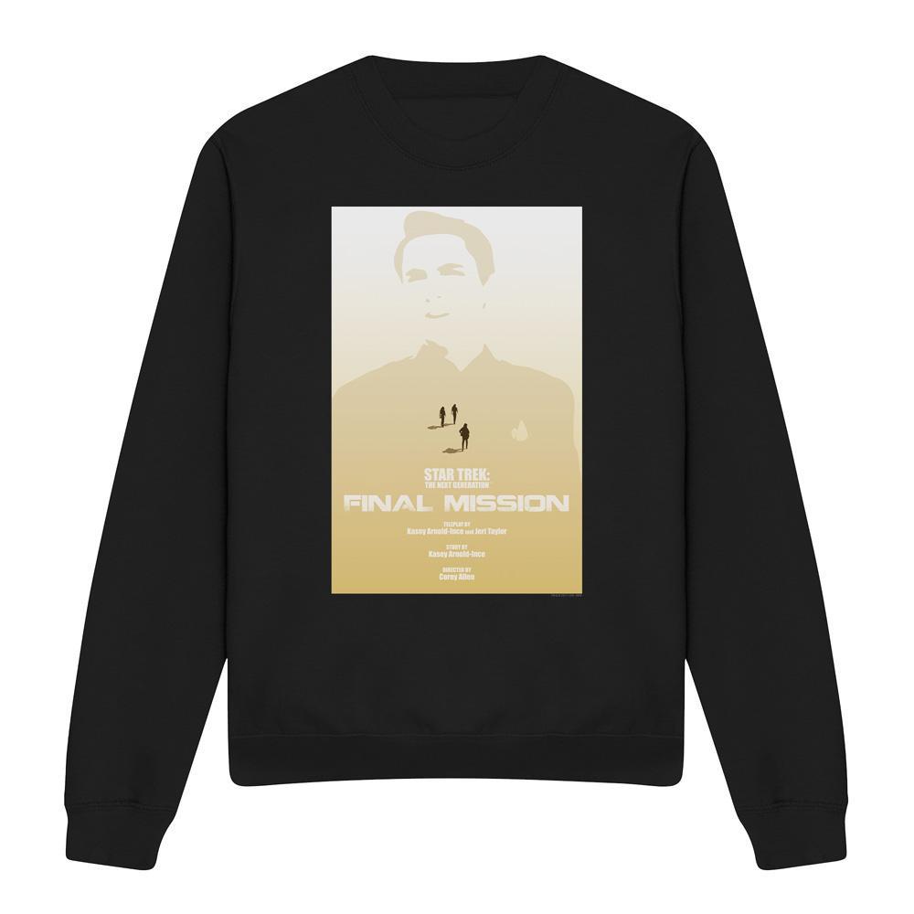 Questa felpa presenta una stampa grafica ispirata a "Star Trek: The Next Generation" Stagione 4, Episodio 9, intitolato "Missione Finale". Il design mostra una silhouette stilizzata di un personaggio con figure più piccole sotto, su uno sfondo sfumato. È un capo comodo e casual per i fan della serie.