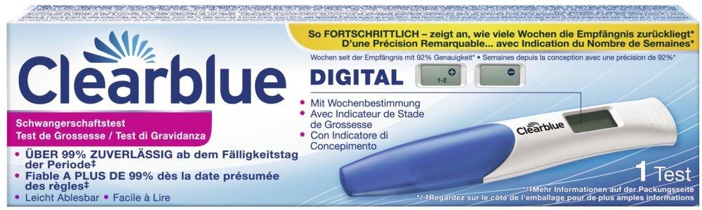 Clearblue DIGITAL test precoce di gravidanza con indicatore di concepimento. L'unico test di gravidanza che vi indica a che punto siete. Offre una sicurezza di oltre il 99% dal giorno in cui dovrebbero iniziare le mestruazioni. Può essere usato fino a 4 giorni prima ed è affidabile al 92% nella determinazione della settimana di gravidanza. Indica il risultato digitale chiaro a parole. Il display mostra le settimane decorse dal concepimento: 1–2, 2–3 o 3+ 2. Per un'affidabilità di oltre il 99%, testatelo dal giorno in cui dovrebbero iniziare le mestruazioni. Test clinici con campioni di urina da gravidanza precoce, hanno dato i seguenti risultati: il 98% delle donne incinte ha ricevuto un risultato positivo (Incinta) un giorno prima di quando avrebbero dovuto iniziare le mestruazioni, il 97% delle donne 2 giorni prima, l'86% delle donne 3 giorni prima e il 55% delle donne 4 giorni prima. In uno studio degli Stati Uniti con 149 donne che hanno usato diversi test visuali, più dell'80% delle donne ha reputato Clearblue Visual il test dall'uso più semplice. Clearblue VISUAL è stato vincitore del Red DotDesign Award 2012.