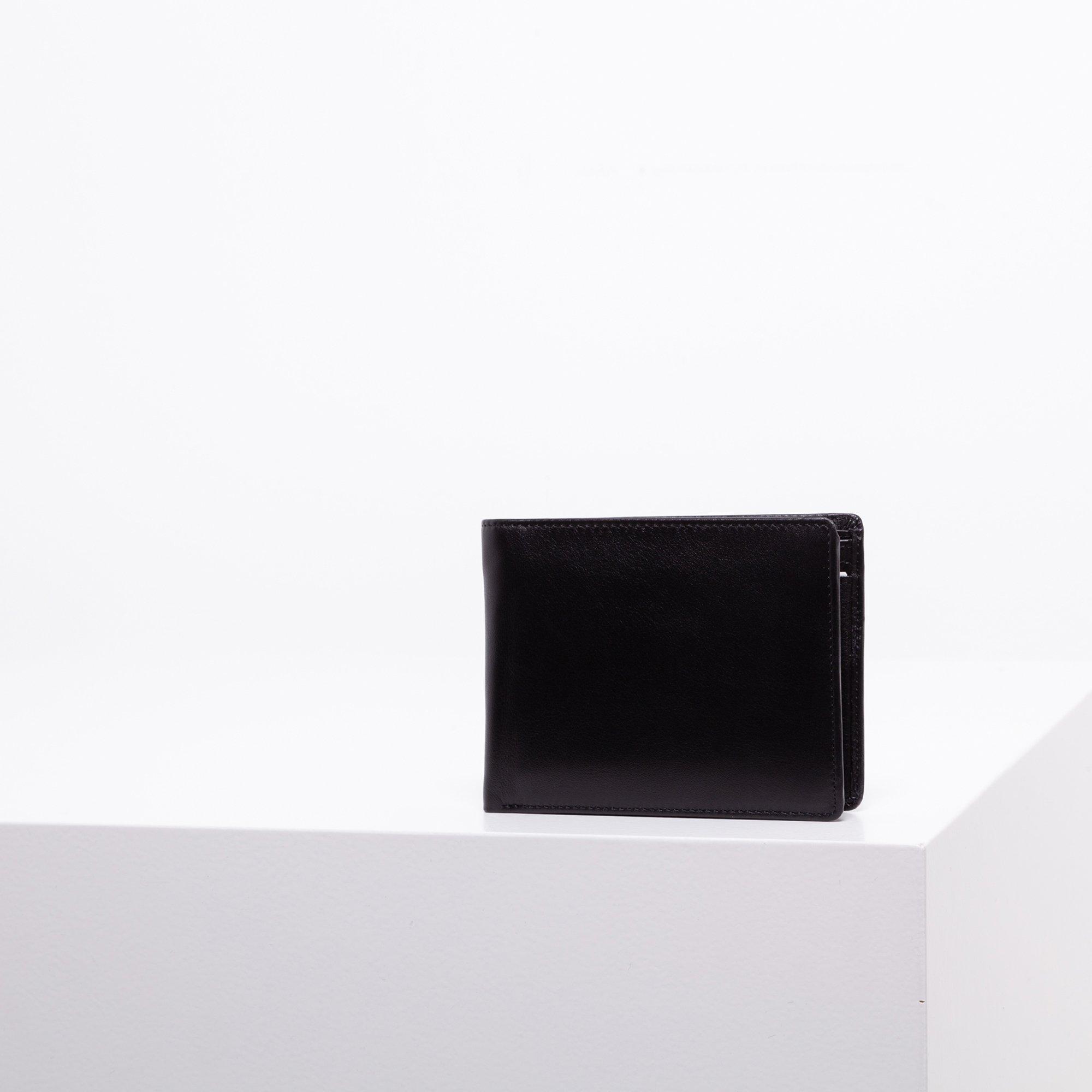 Questo portafoglio classico, realizzato in morbida pelle bovina, si distingue per il suo design elegante e intramontabile. L'interno capiente offre spazio per contanti, carte di credito e carta d'identità, con scomparto per banconote, portamonete e scomparti aperti.